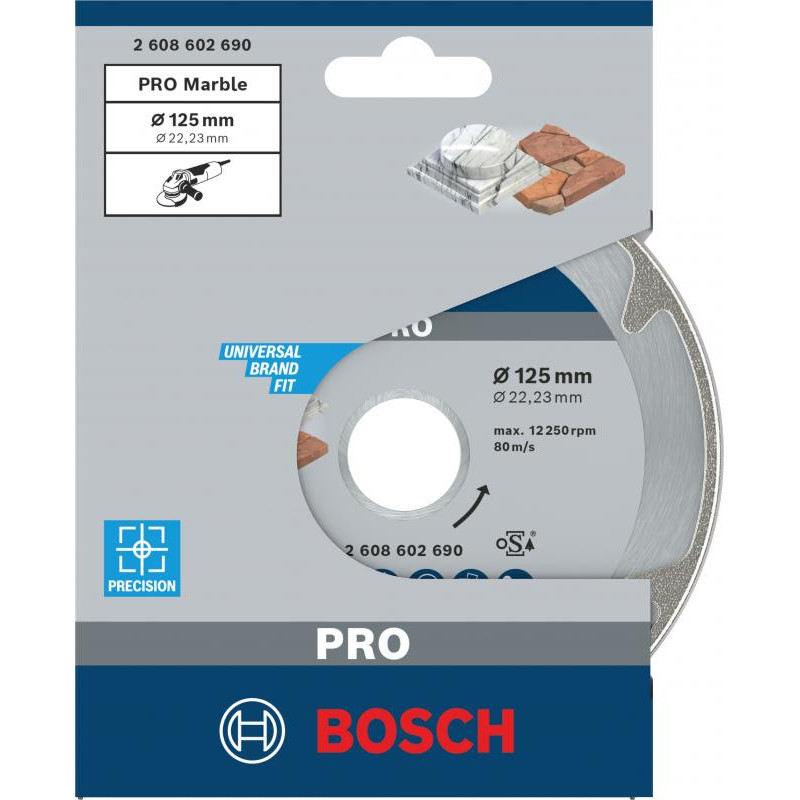 Emballage: 1Marque: BoschRéférence: 2608602690EAN: 3165140581967Description: Disque diamant PRO Marble 125x22,23 mm