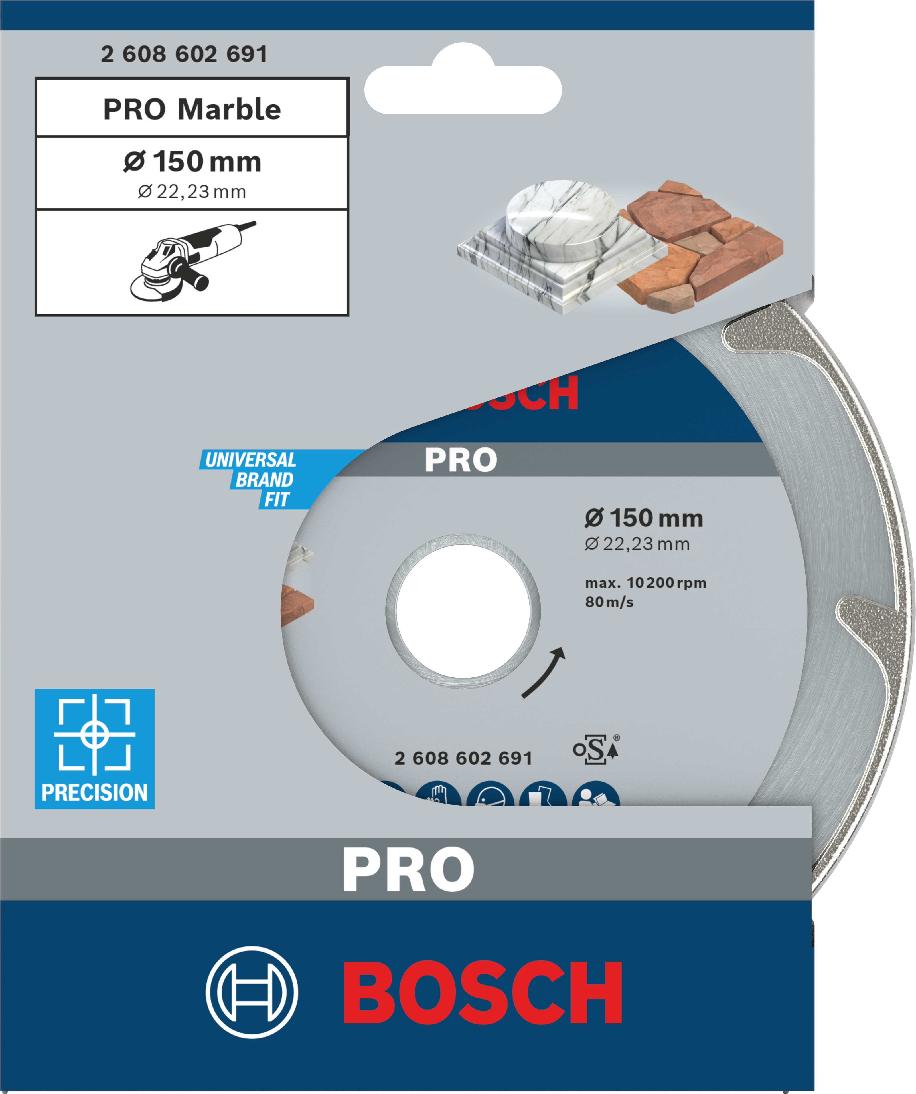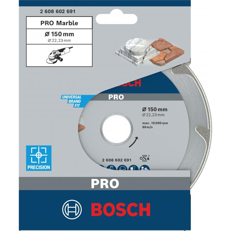 Emballage: 1Marque: BoschRéférence: 2608602691EAN: 3165140581974Description: Disque diamant PRO Marble 150x22,23 mm