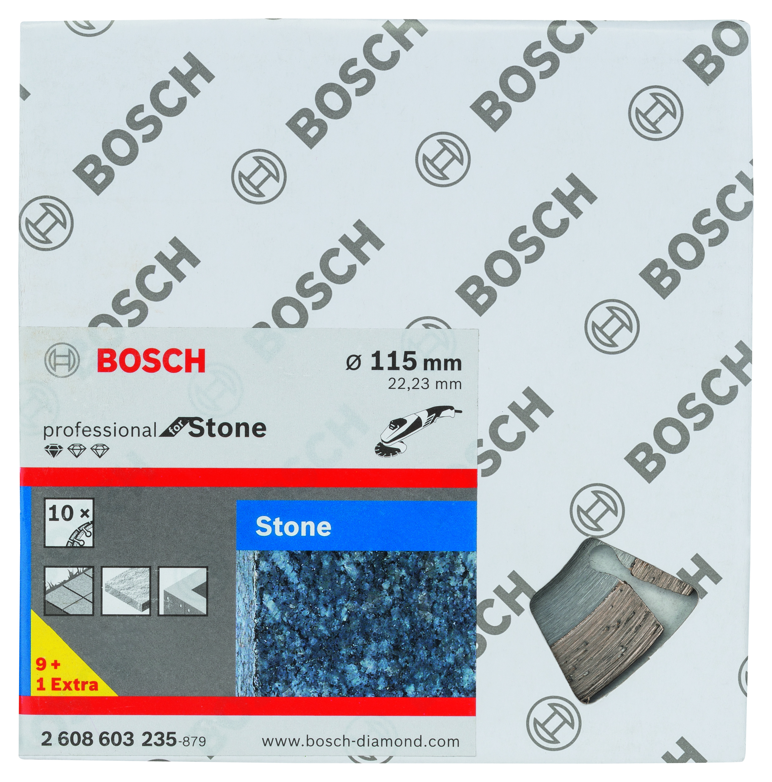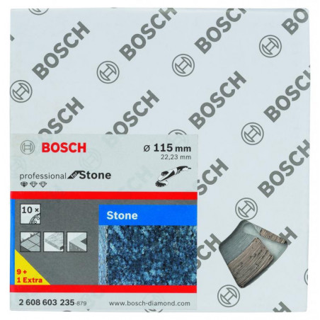 Emballage: 10 Marque: Bosch Référence: 2608603235 EAN: 3165140665773 Description: Disque à tronçonner diamanté Standard for Stone 115 x 22,23 x 1,6 x 10 mm 10x