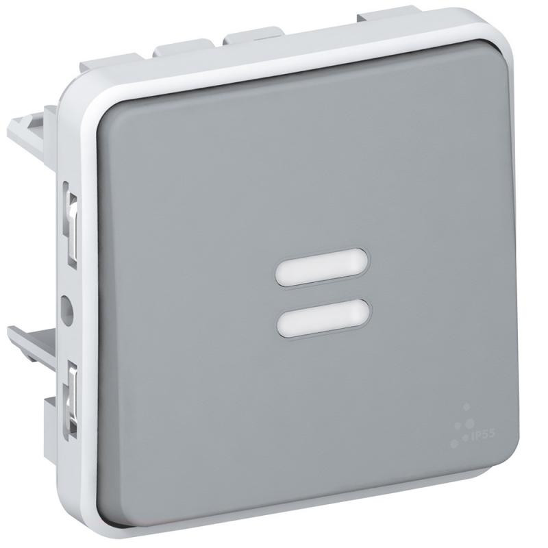 Description: Plexo composable poussoir NO lumineux - 10 A - gris - IP 55 - IK 07 - avec bornes automatiques