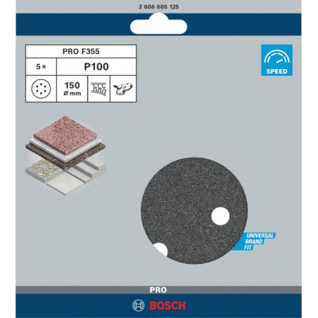 Emballage: 5Marque: BoschRéférence: 2608605125EAN: 3165140159432Description: 5 Disques de ponçage PRO F355 150 mm G100