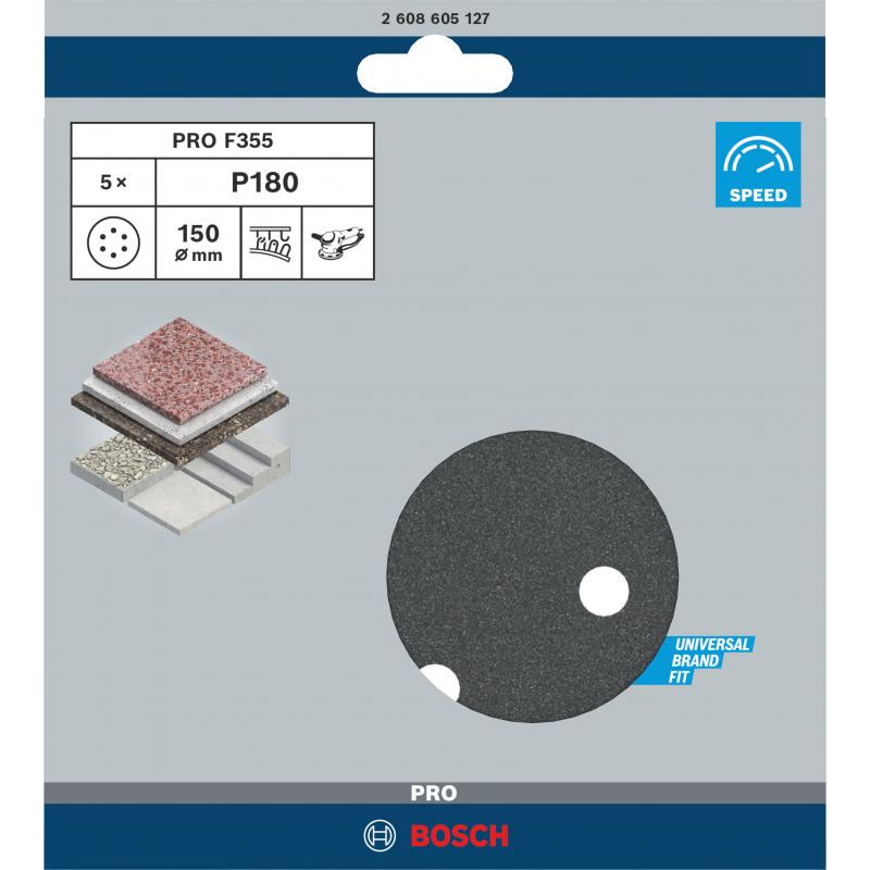 Emballage: 5Marque: BoschRéférence: 2608605127EAN: 3165140159456Description: 5 Disques de ponçage PRO F355 150 mm G180
