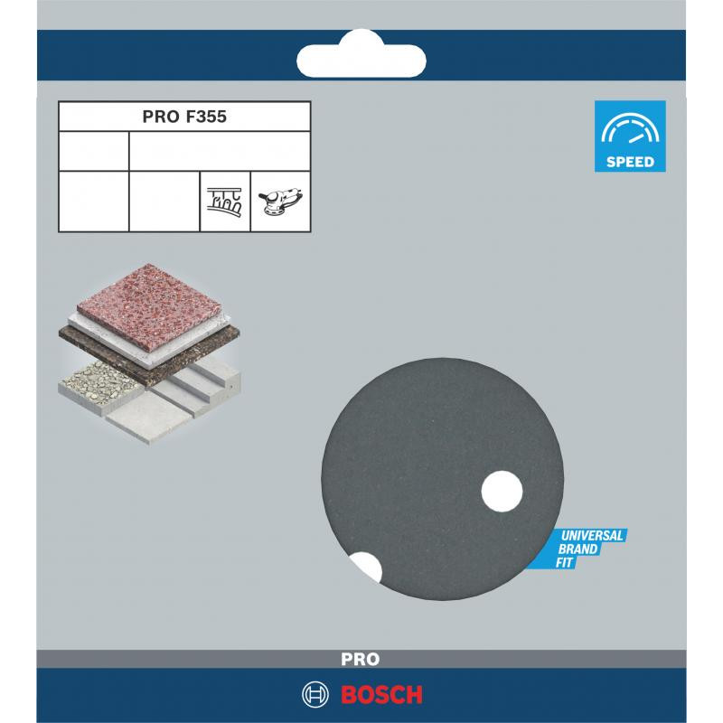 Emballage: 5Marque: BoschRéférence: 2608605131EAN: 3165140159494Description: 5 Disques de ponçage PRO F355 150 mm G600