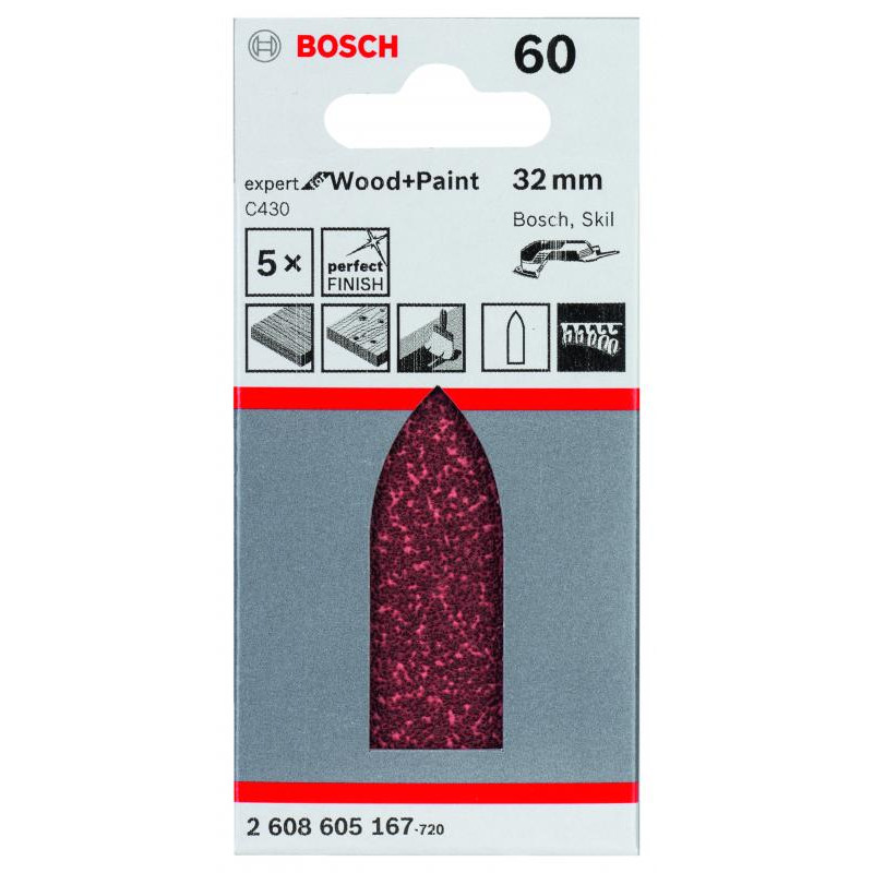 Emballage: 5Marque: BoschRéférence: 2608605167EAN: 3165140159852Description: Abrasif C430 Expert for Wood and Paint, 32 mm, grain 60, 5x