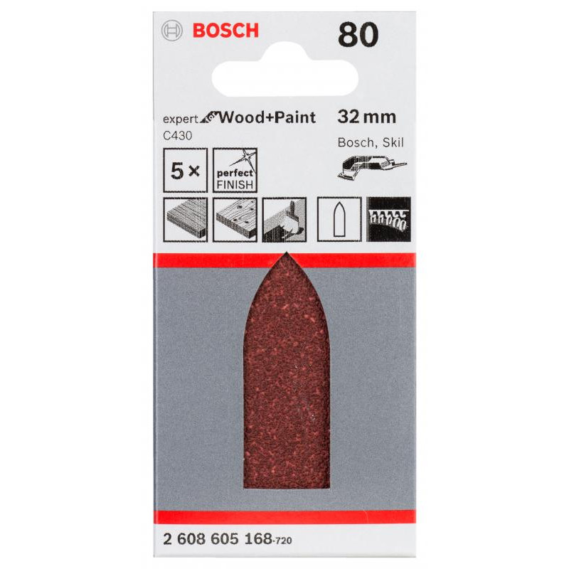 Emballage: 5Marque: BoschRéférence: 2608605168EAN: 3165140159869Description: Abrasif C430 Expert for Wood and Paint, 32 mm, grain 80, 5x