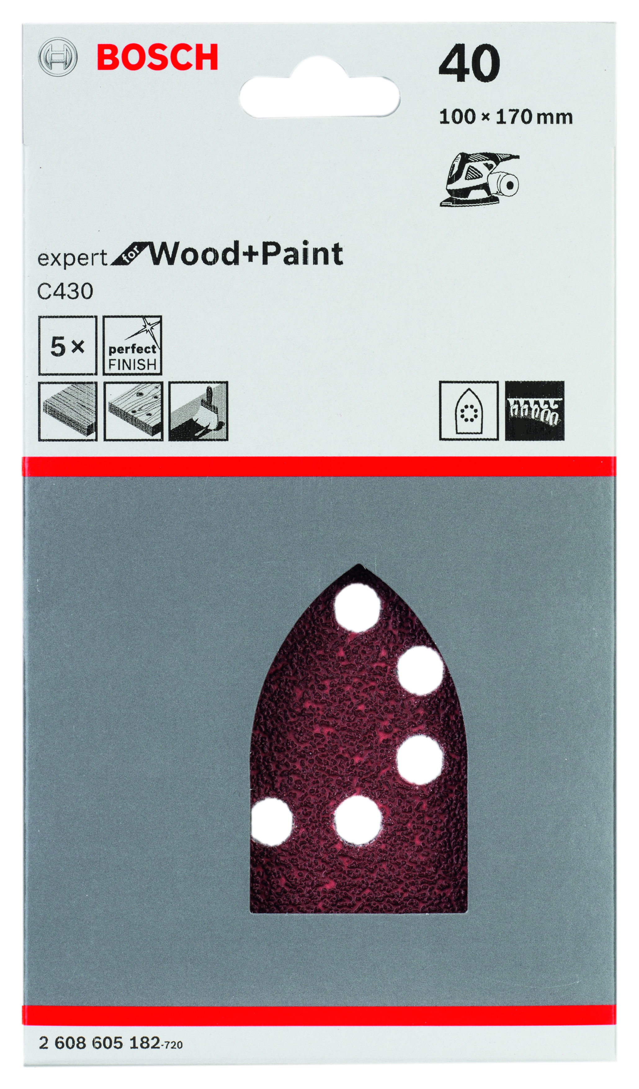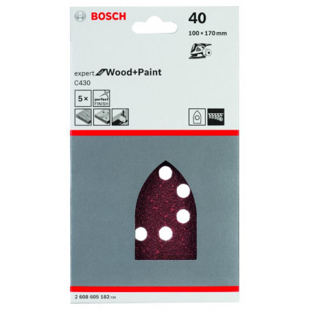 Emballage: 5Marque: BoschRéférence: 2608605182EAN: 3165140160001Description: Abrasif C430 Expert for Wood and Paint, 100 x 170 mm, grain 40, 5x