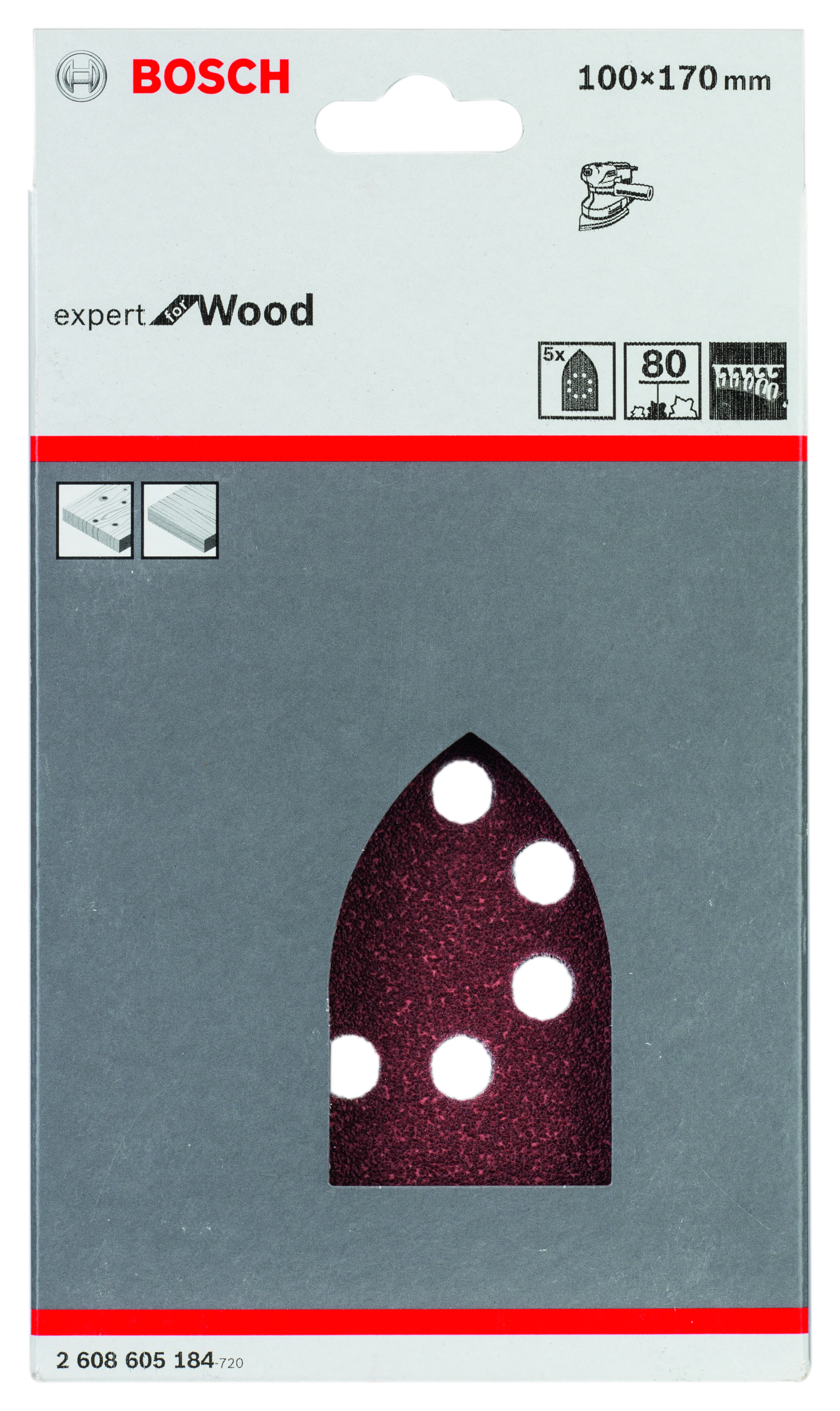 Emballage: 5Marque: BoschRéférence: 2608605184EAN: 3165140160025Description: Abrasif C430 Expert for Wood and Paint, 100 x 170 mm, grain 80, 5x