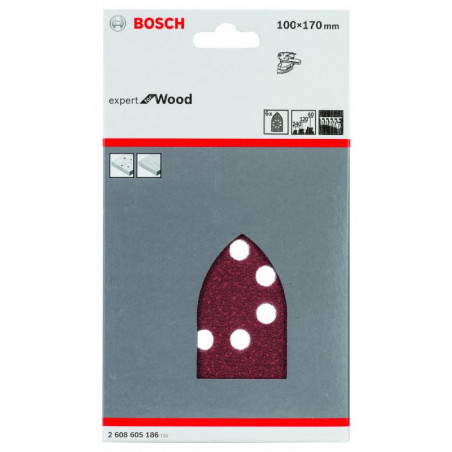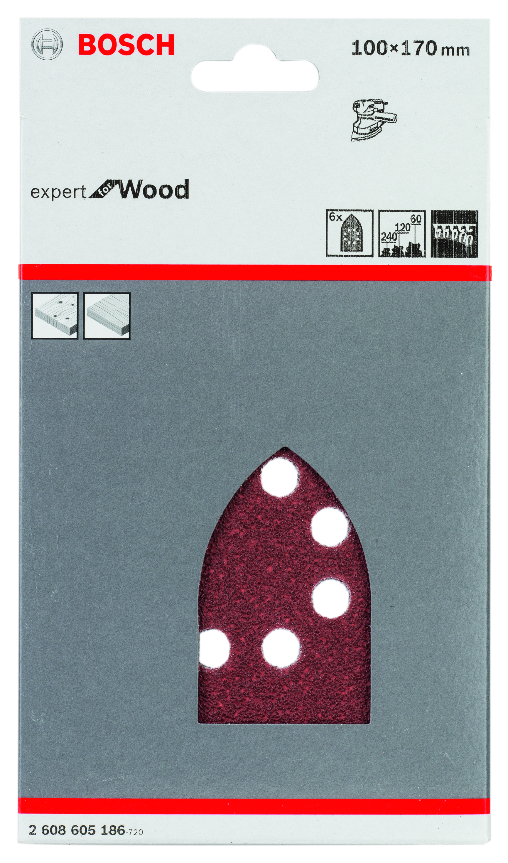Emballage: 6Marque: BoschRéférence: 2608605186EAN: 3165140160049Description: Abrasif C430 Expert for Wood and Paint, 100 x 170 mm, grain 2x60; 2x120; 2x240