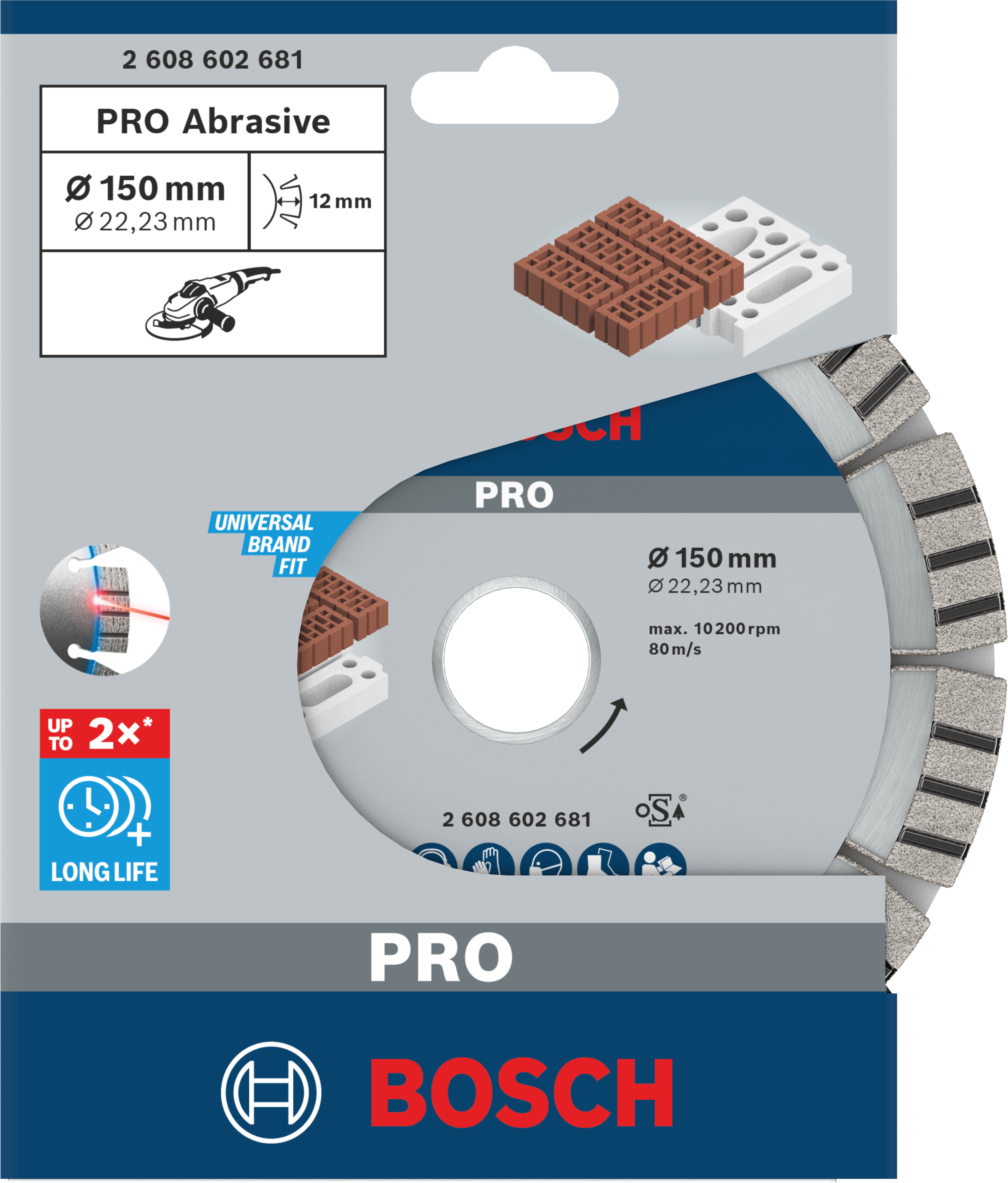 Emballage: 1Marque: BoschRéférence: 2608602681EAN: 3165140581875Description: Disque diamant PRO Abrasive 150x22,23 mm