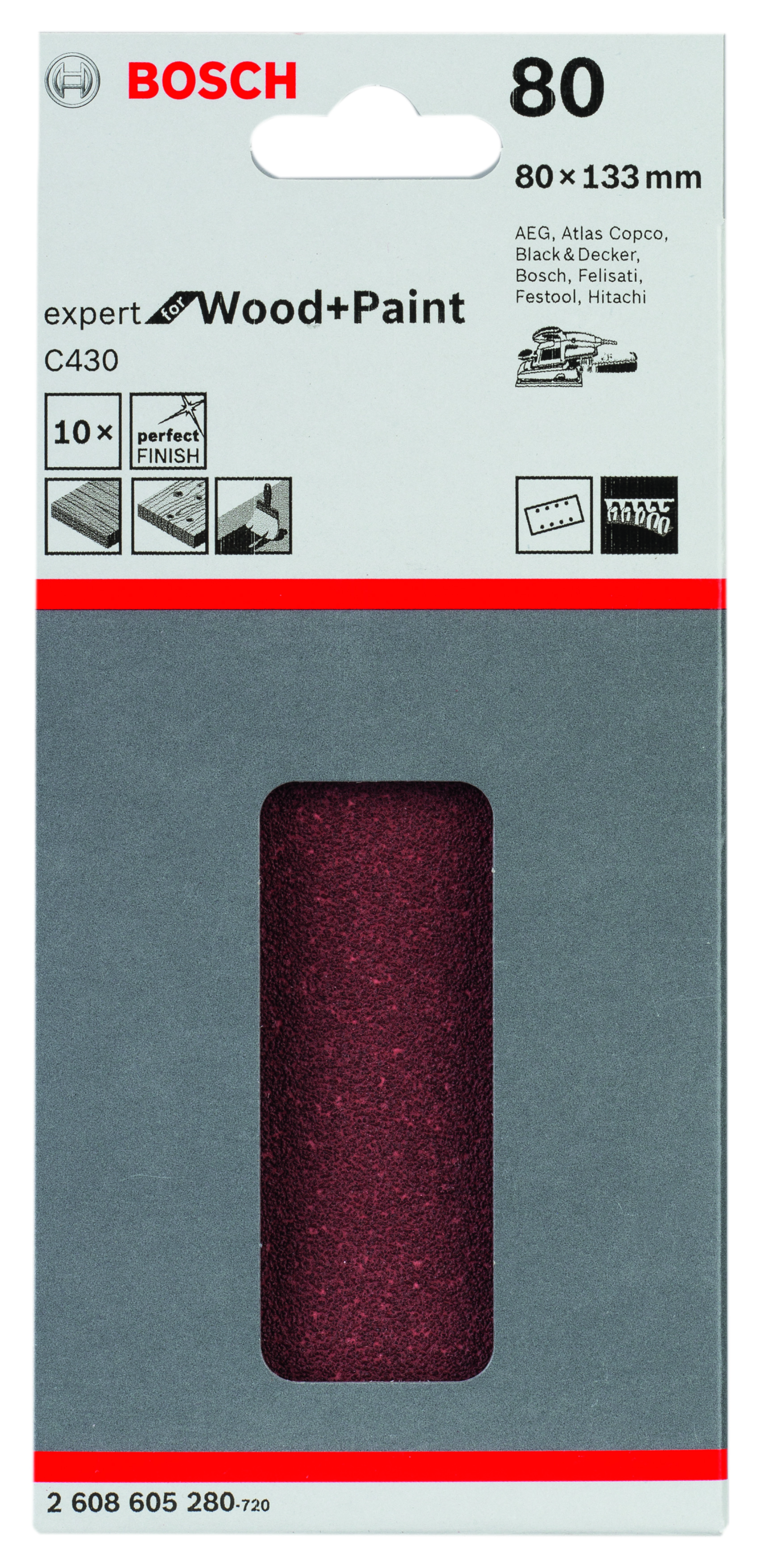 Abrasif C430 Expert for Wood and Paint, 80 x 133 mm, grain 80, 8 trous, 10x