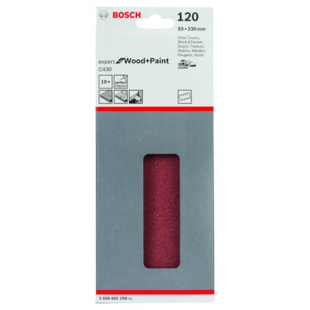 Emballage: 10Marque: BoschRéférence: 2608605298EAN: 3165140161152Description: Abrasif C430 Expert for Wood and Paint, 93 x 230 mm, grain 120, 8 trous, 10x
