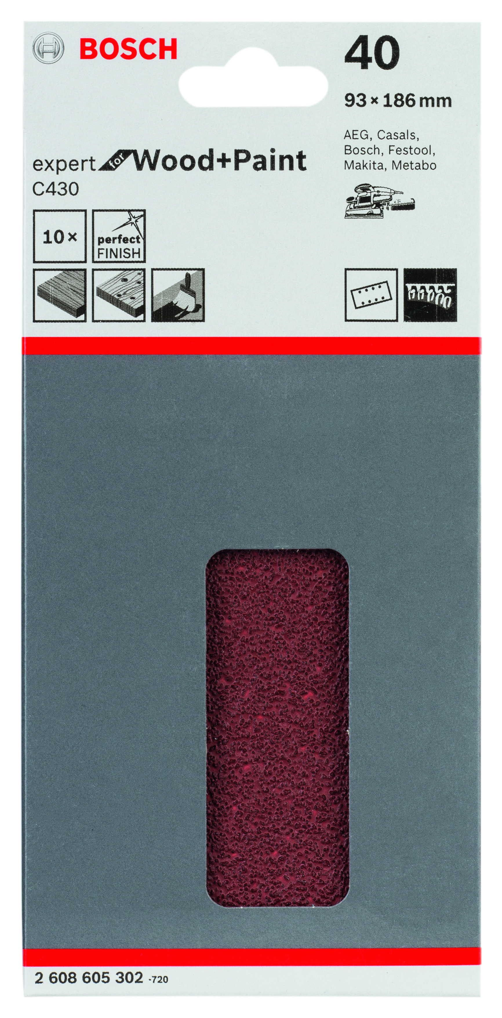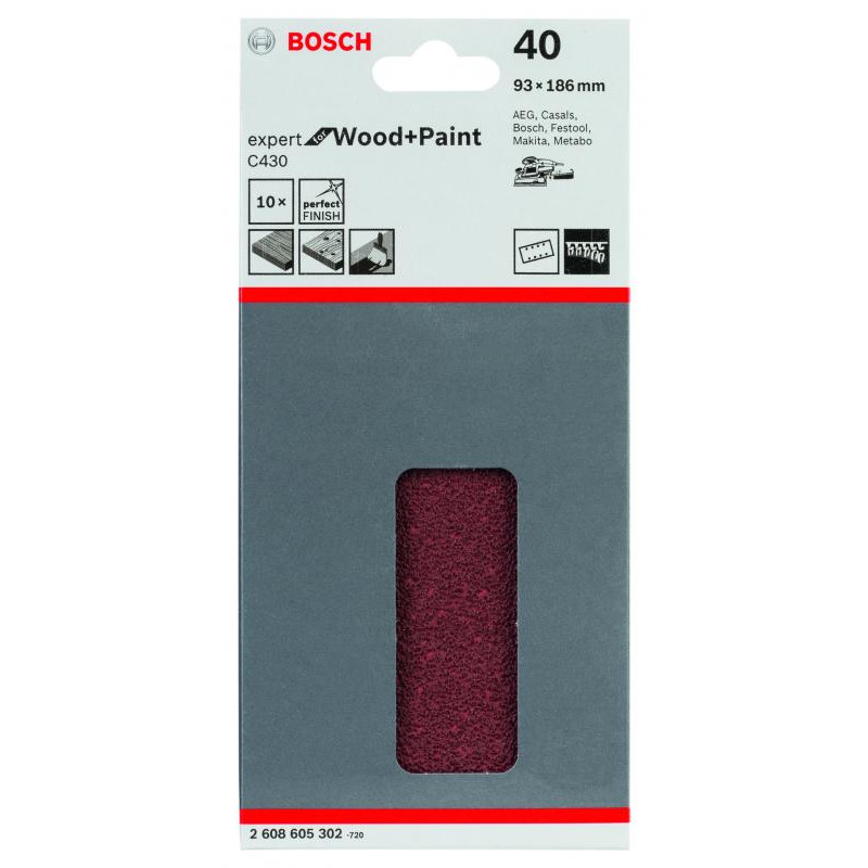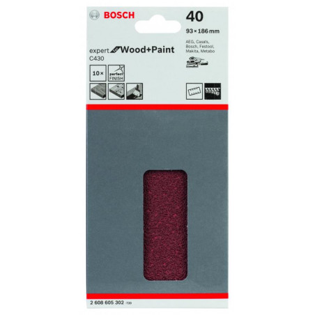 Emballage: 10Marque: BoschRéférence: 2608605302EAN: 3165140161190Description: Abrasif C430 Expert for Wood and Paint, 93 x 186 mm, grain 40, 8 trous, 10x
