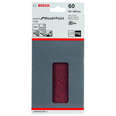 Emballage: 10Marque: BoschRéférence: 2608605303EAN: 3165140161206Description: Abrasif C430 Expert for Wood and Paint, 93 x 186 mm, grain 60, 8 trous, 10x