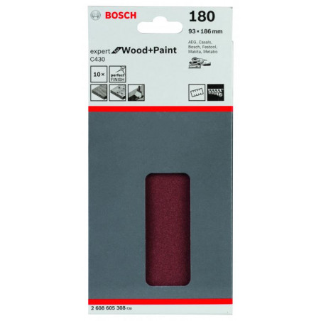Emballage: 10Marque: BoschRéférence: 2608605308EAN: 3165140161251Description: Abrasif C430 Expert for Wood and Paint, 93 x 186 mm, grain 180, 8 trous, 10x