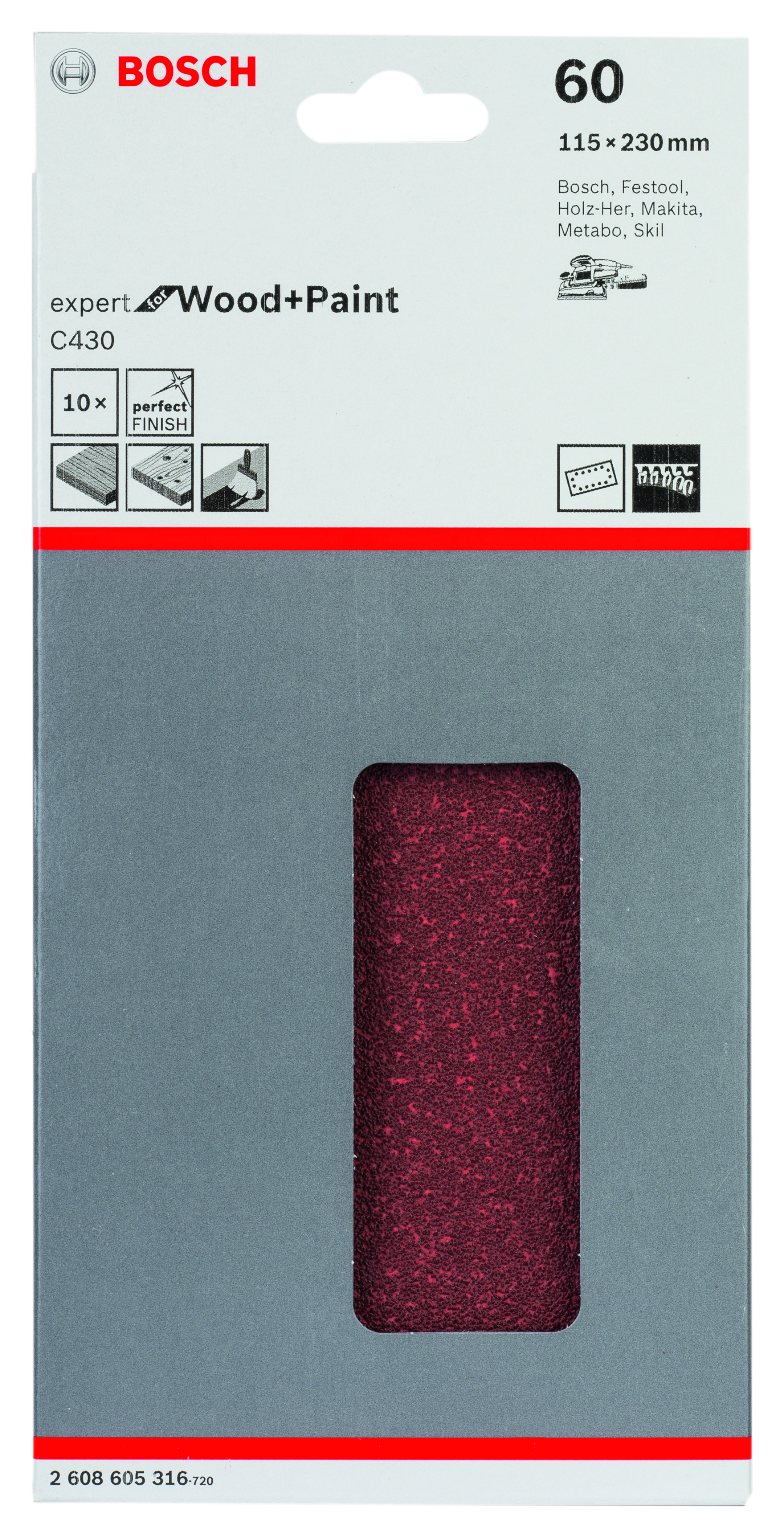 Emballage: 10Marque: BoschRéférence: 2608605316EAN: 3165140161336Description: Abrasif C430 Expert for Wood and Paint, 115 x 230 mm, grain 60, 14 trous, 10x