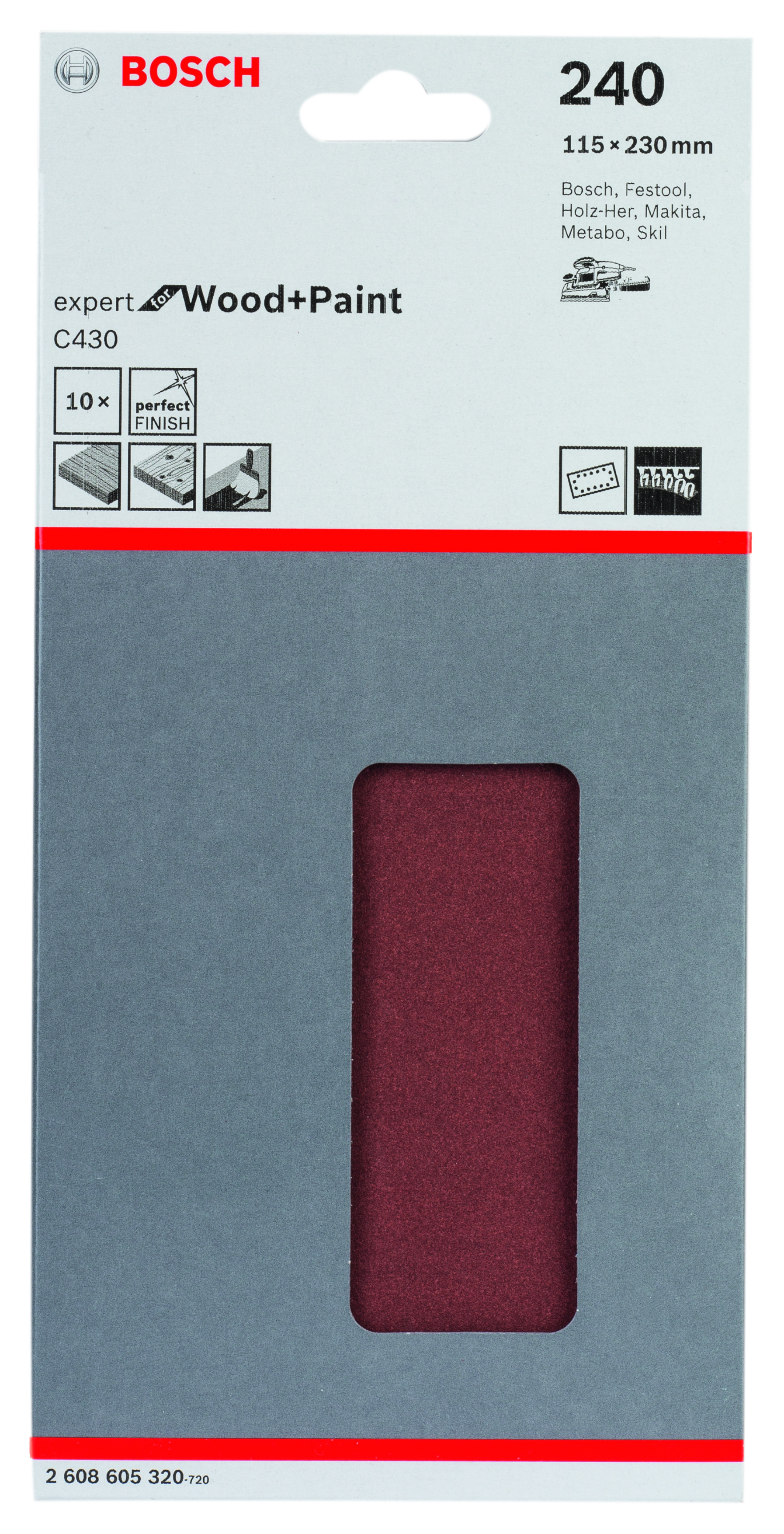 Emballage: 10Marque: BoschRéférence: 2608605320EAN: 3165140161374Description: Abrasif C430 Expert for Wood and Paint, 115 x 230 mm, grain 240, 14 trous, 10x