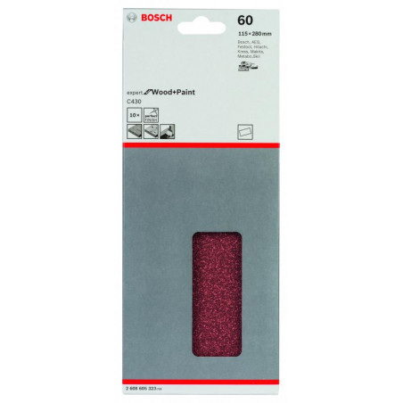 Emballage: 10Marque: BoschRéférence: 2608605323EAN: 3165140161404Description: Abrasif C430 Expert for Wood and Paint, 115 x 280 mm, grain 60, 10x