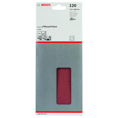 Emballage: 10Marque: BoschRéférence: 2608605325EAN: 3165140161428Description: Abrasif C430 Expert for Wood and Paint, 115 x 280 mm, grain 120, 10x
