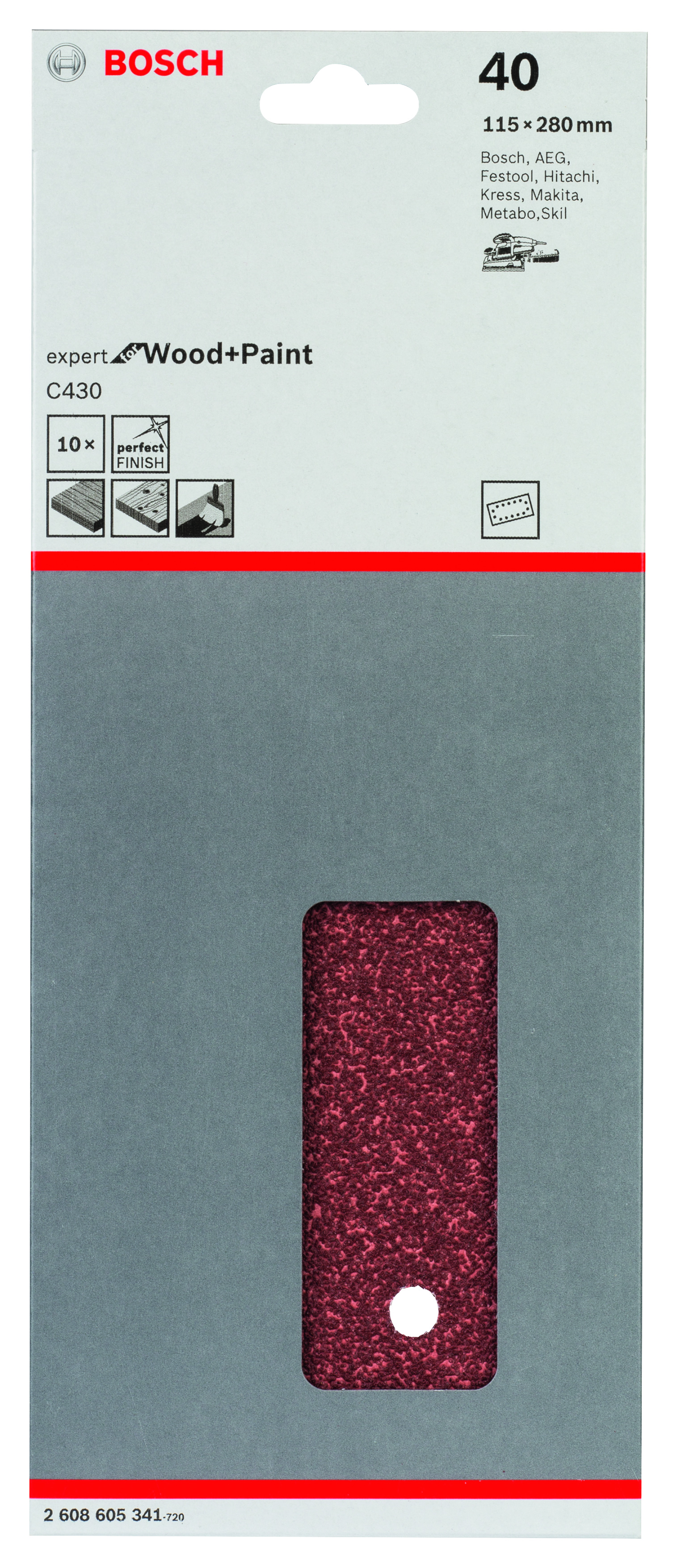 Emballage: 10Marque: BoschRéférence: 2608605341EAN: 3165140161589Description: Abrasif C430 Expert for Wood and Paint, 115 x 280 mm, grain 40, 14 trous, 10x