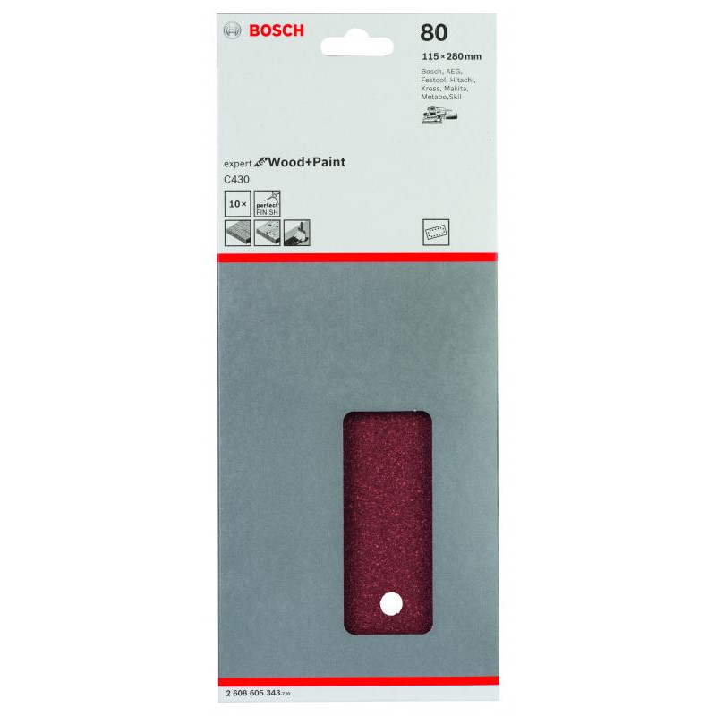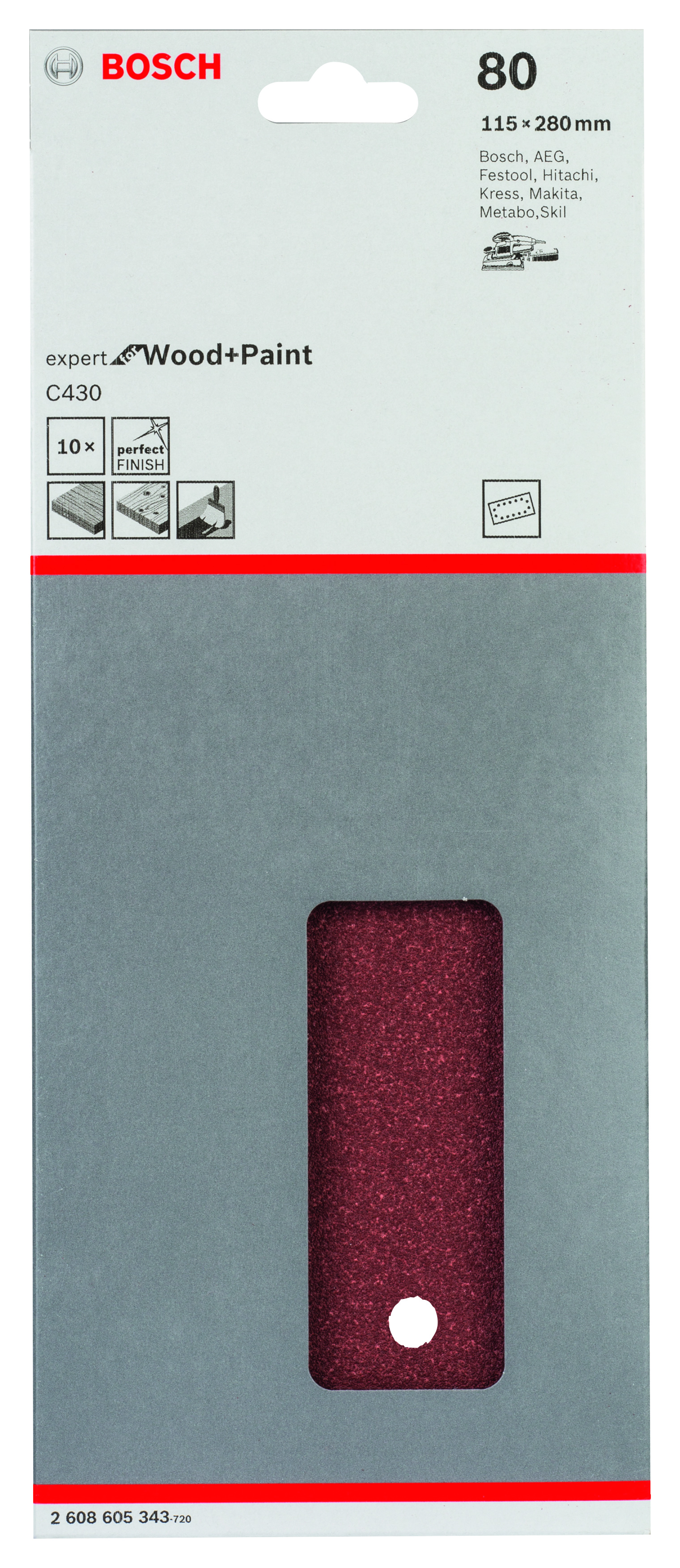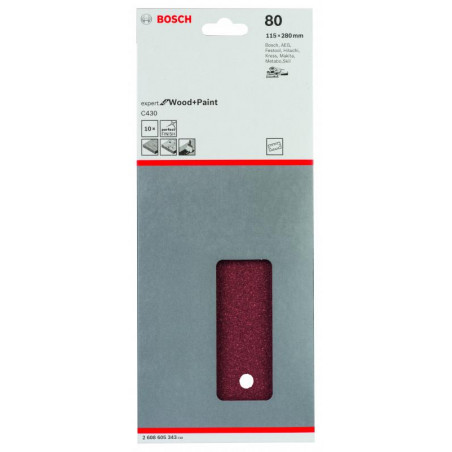 Emballage: 10Marque: BoschRéférence: 2608605343EAN: 3165140161602Description: Abrasif C430 Expert for Wood and Paint, 115 x 280 mm, grain 80, 14 trous, 10x