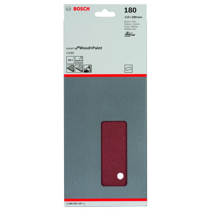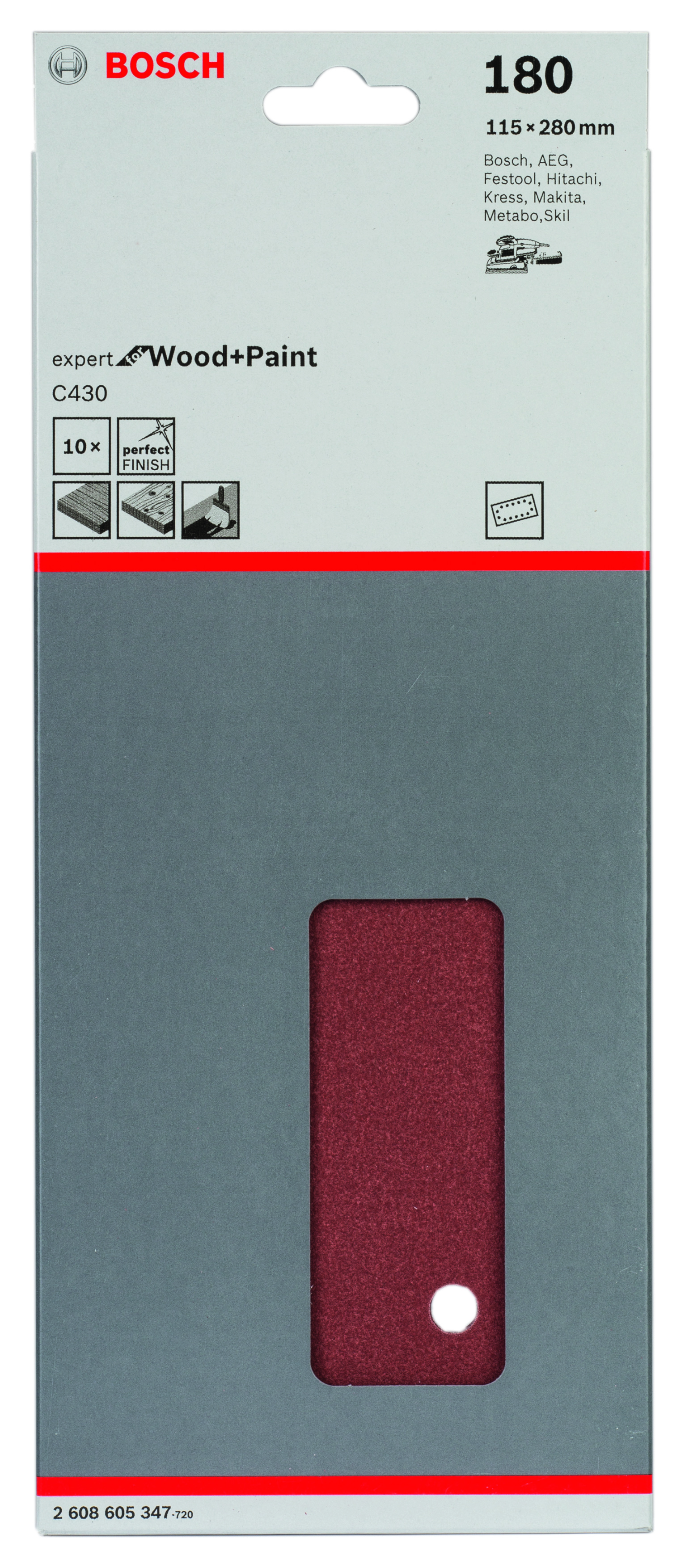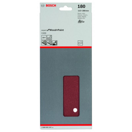 Emballage: 10Marque: BoschRéférence: 2608605347EAN: 3165140161640Description: Abrasif C430 Expert for Wood and Paint, 115 x 280 mm, grain 180, 14 trous, 10x