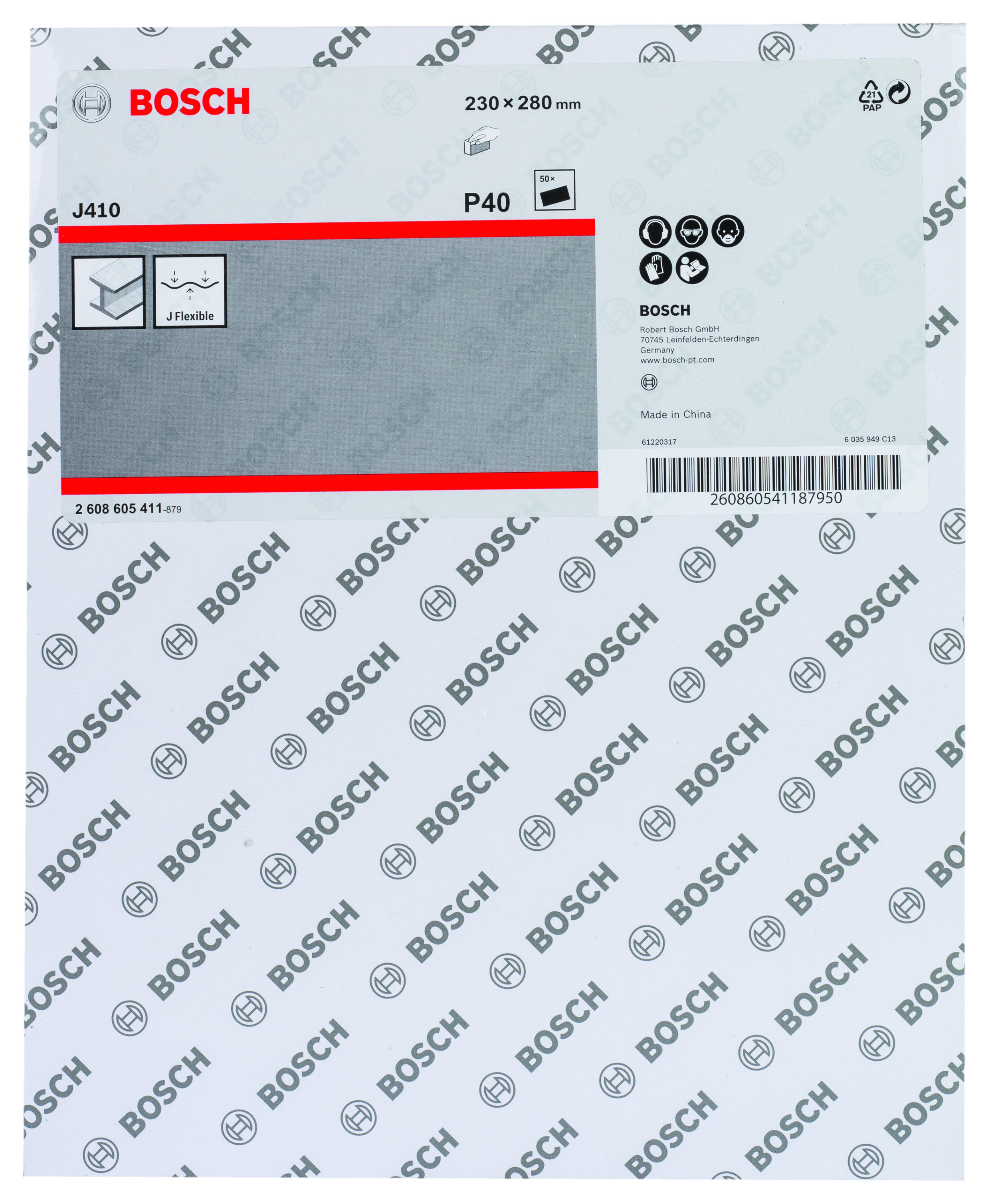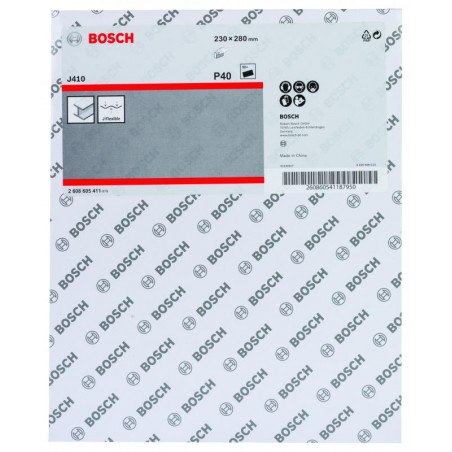 Emballage: 1Marque: BoschRéférence: 2608605411EAN: 3165140162319Description: Abrasif J410 Standard for Metal, 230 x 280 mm, grain 40