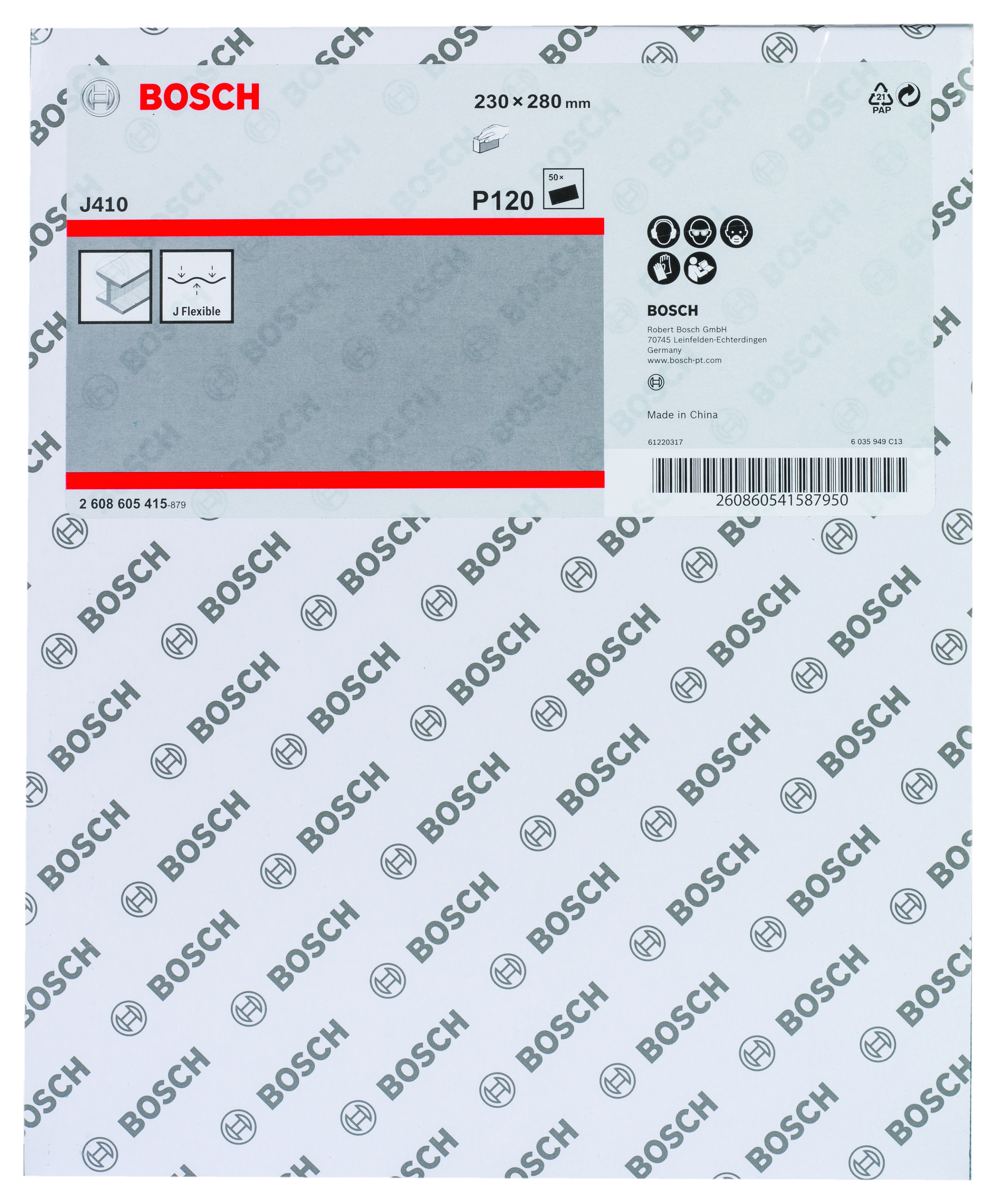 Emballage: 1Marque: BoschRéférence: 2608605415EAN: 3165140162357Description: Abrasif J410 Standard for Metal, 230 x 280 mm, grain 120