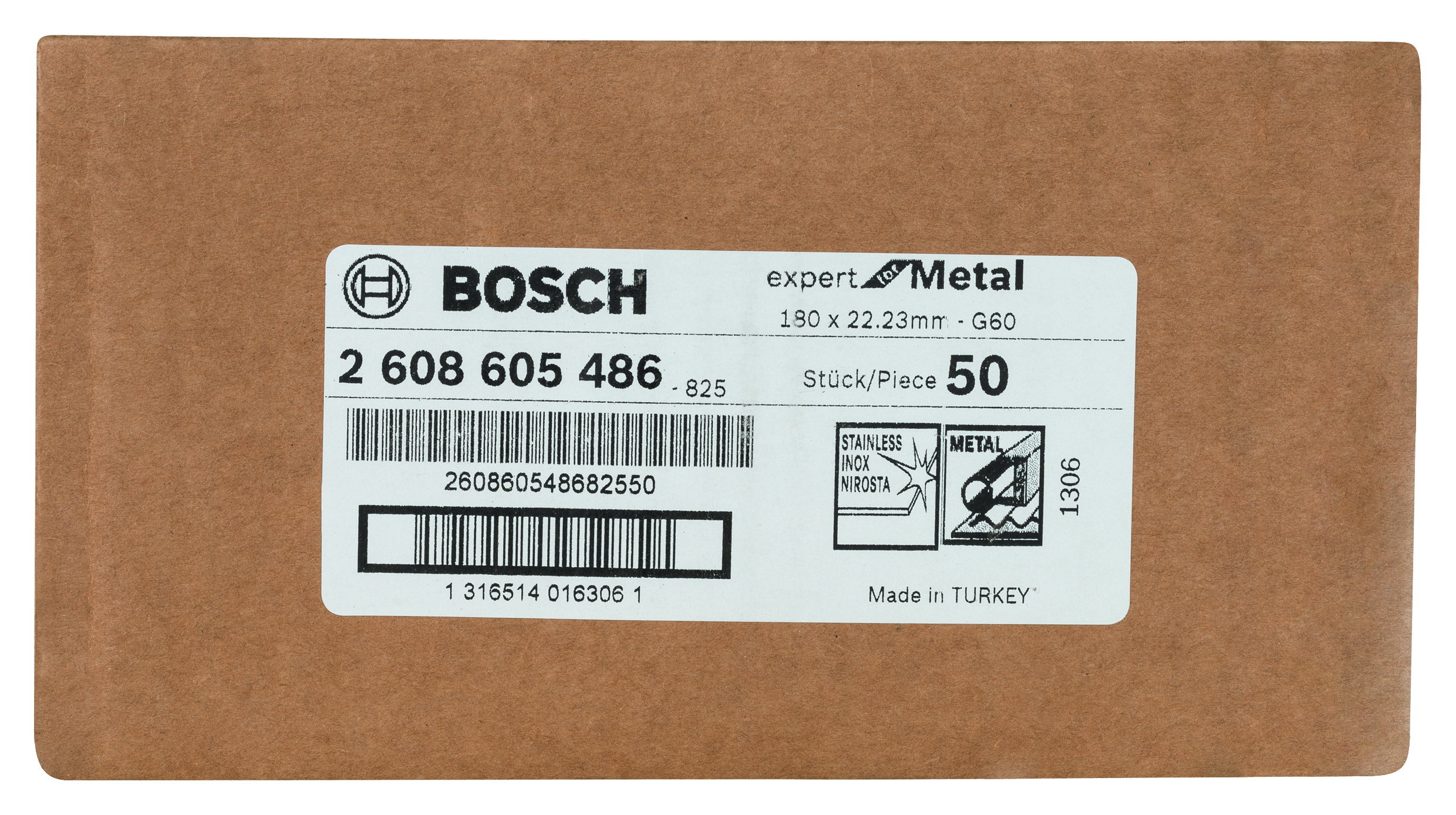 Emballage: 1Marque: BoschRéférence: 2608605486EAN: 3165140163064Description: Disque abrasif sur fibre R444 Expert for Metal, diamètre 180 mm, grain 60