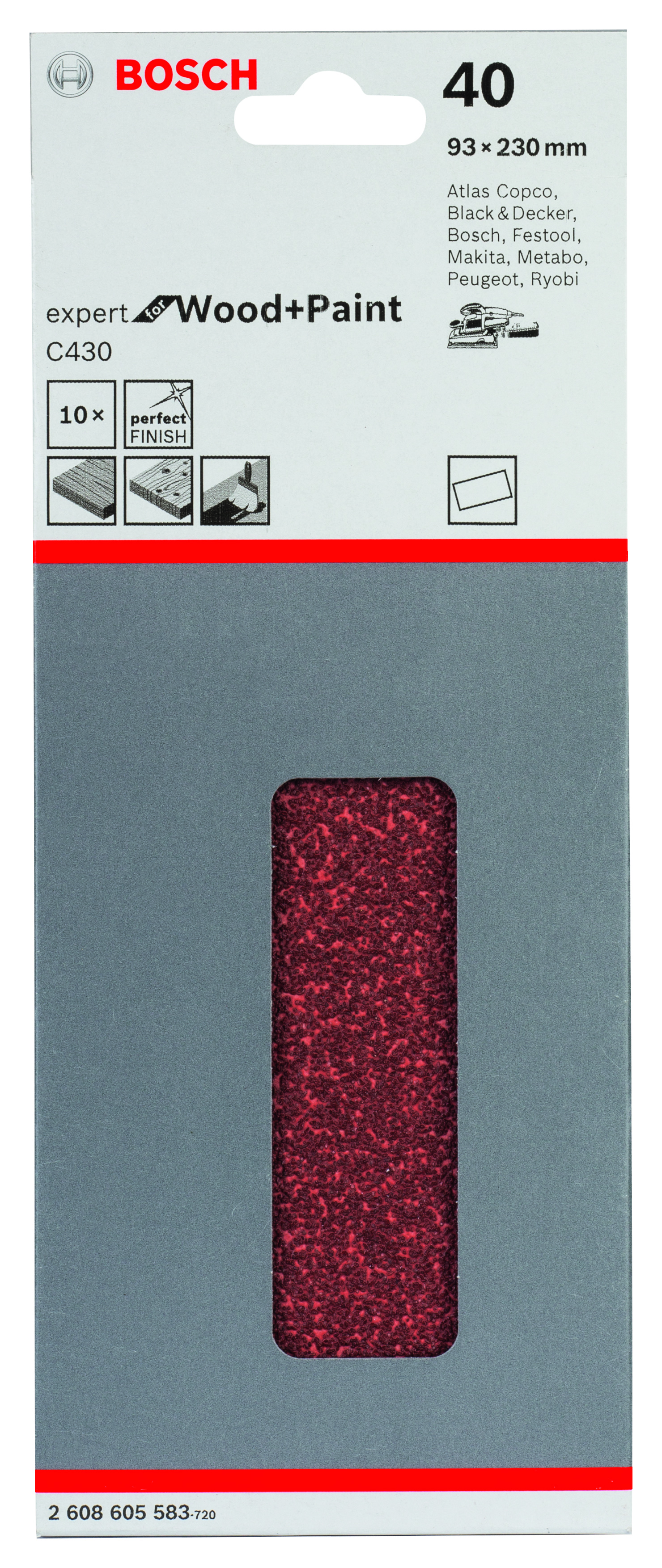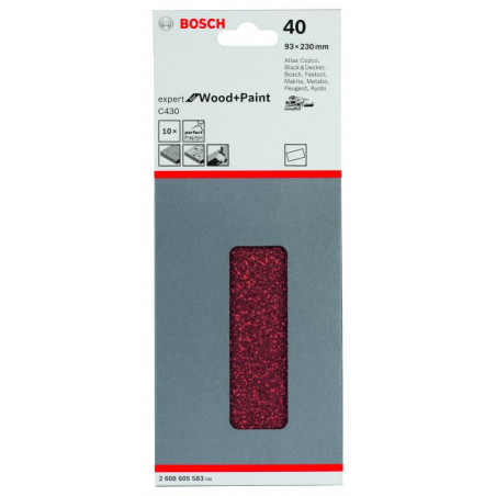 Emballage: 10Marque: BoschRéférence: 2608605583EAN: 3165140170673Description: Abrasif C430 Expert for Wood and Paint, 93 x 230 mm, grain 40, 10x