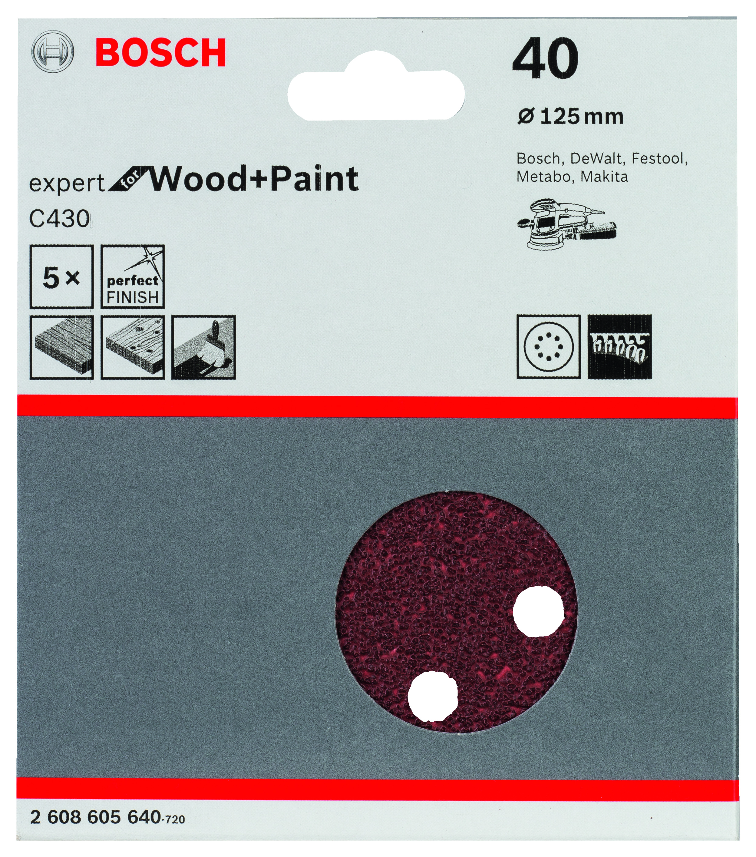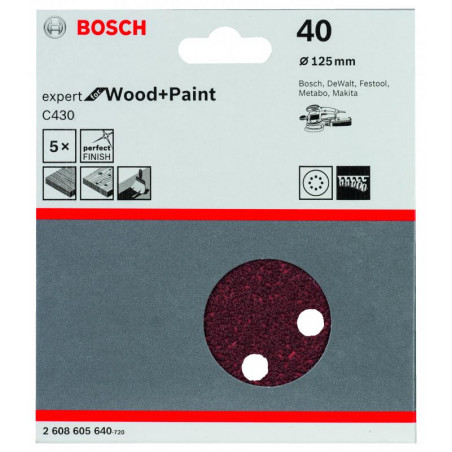 Emballage: 5Marque: BoschRéférence: 2608605640EAN: 3165140171243Description: Abrasif C430 Expert for Wood and Paint, diamètre 125 mm, grain 40, 8 trous, 5x