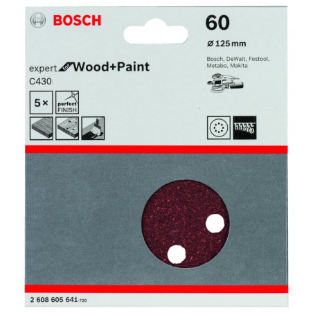 Emballage: 5Marque: BoschRéférence: 2608605641EAN: 3165140171250Description: Abrasif C430 Expert for Wood and Paint, diamètre 125 mm, grain 60, 8 trous, 5x