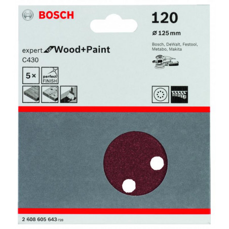 Emballage: 5Marque: BoschRéférence: 2608605643EAN: 3165140171274Description: Abrasif C430 Expert for Wood and Paint, diamètre 125 mm, grain 120, 8 trous, 5x