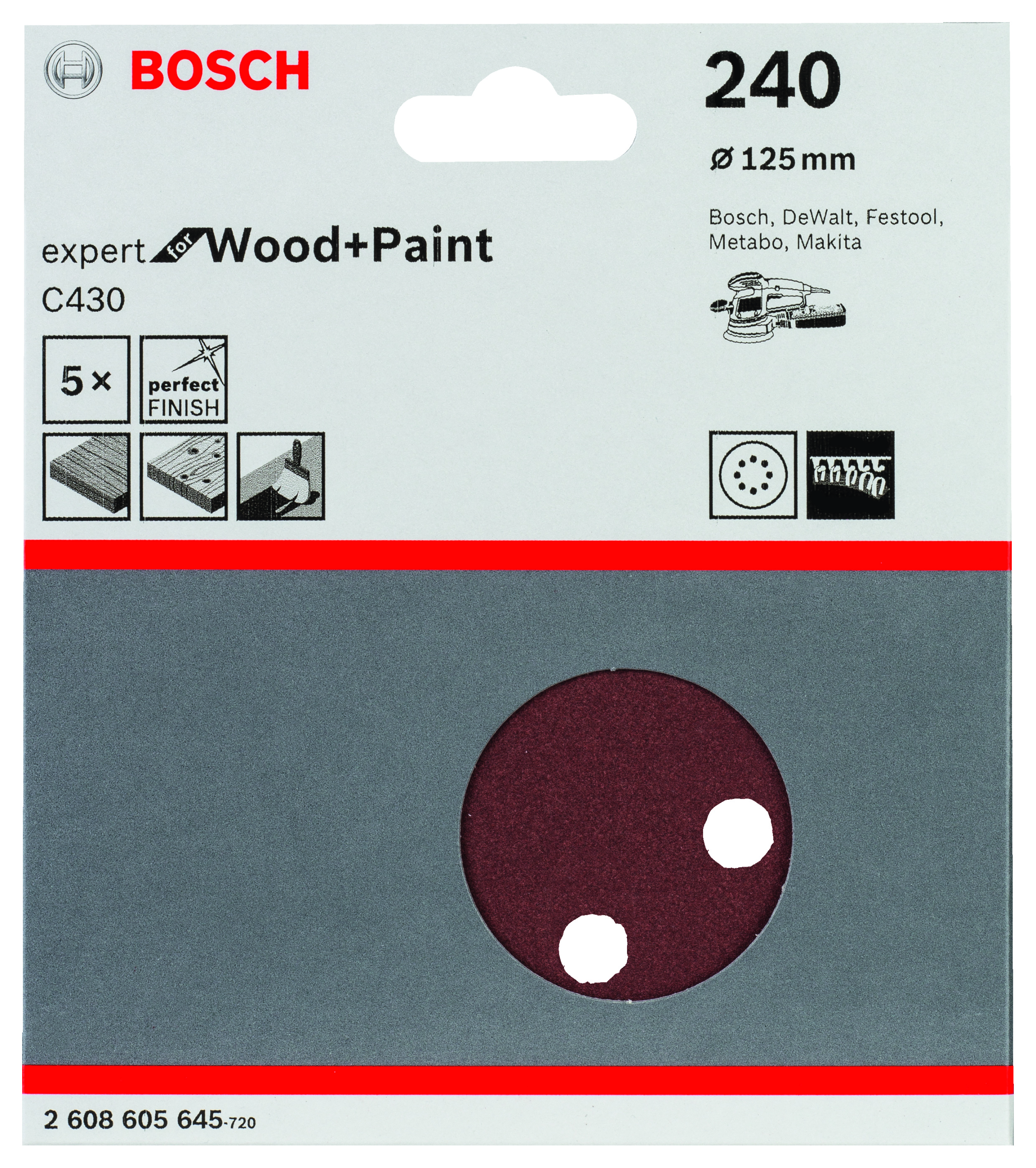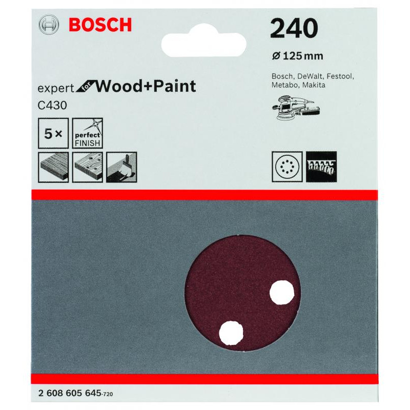 Emballage: 5Marque: BoschRéférence: 2608605645EAN: 3165140171298Description: Abrasif C430 Expert for Wood and Paint, diamètre 125 mm, grain 240, 8 trous, 5x