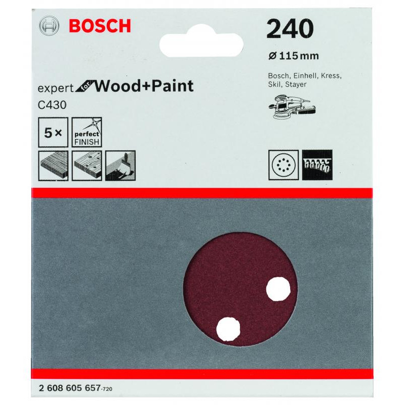 Emballage: 5Marque: BoschRéférence: 2608605657EAN: 3165140171410Description: Abrasif C430 Expert for Wood and Paint, diamètre 115 mm, grain 240, 8 trous, 5x