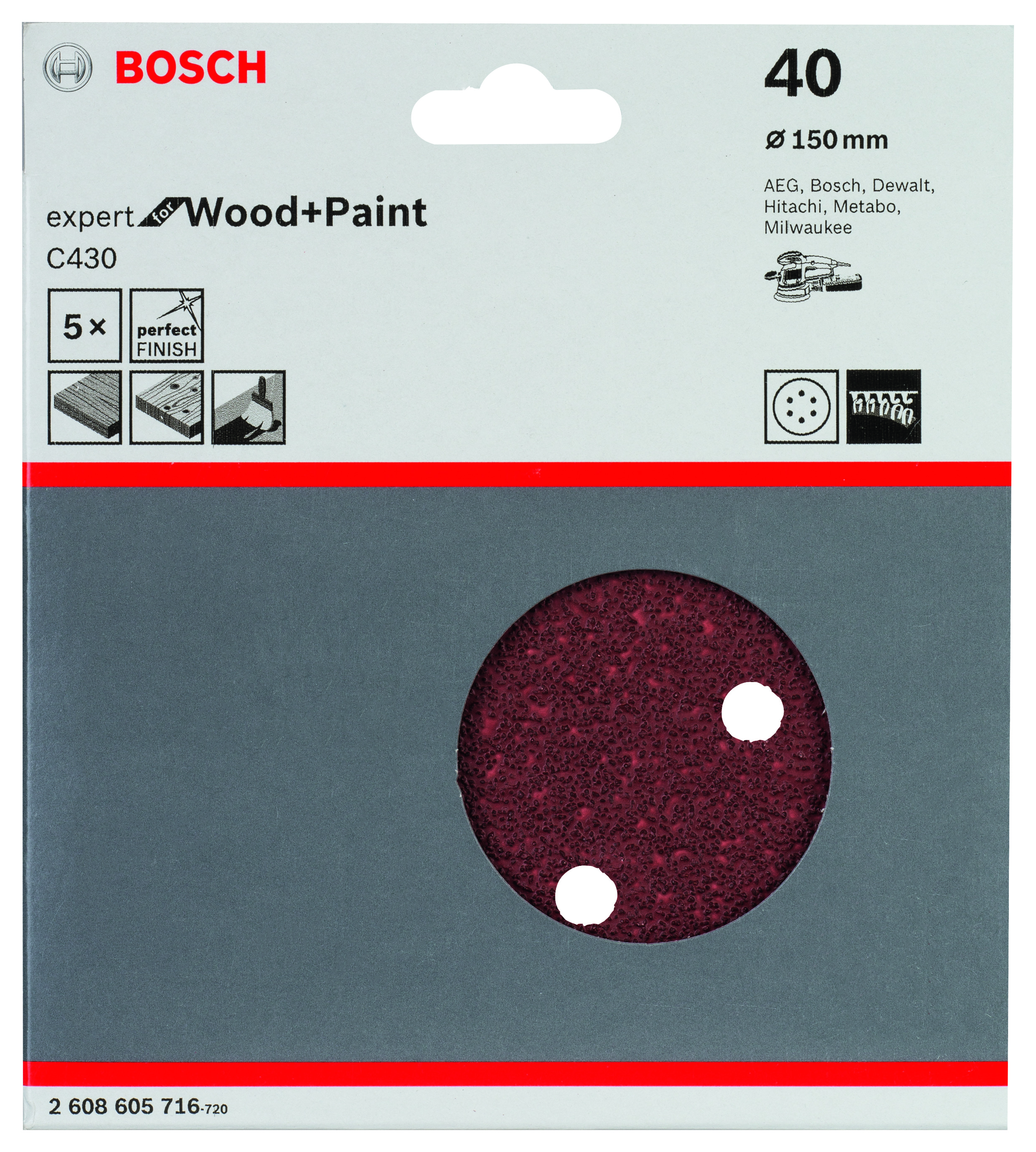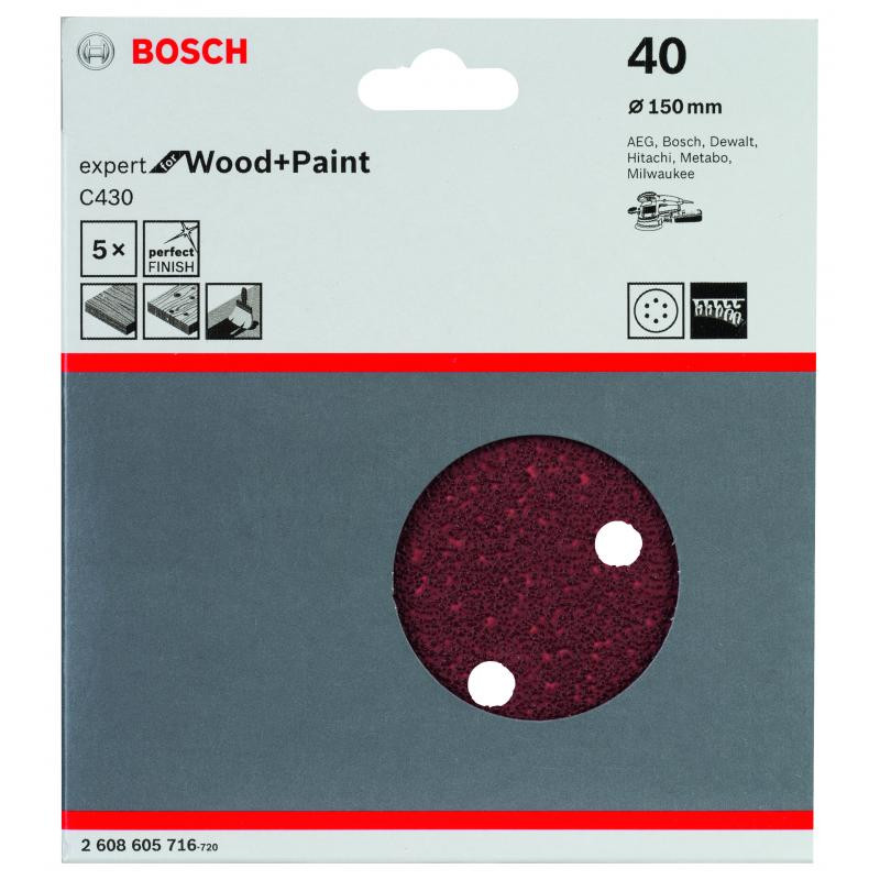Emballage: 5Marque: BoschRéférence: 2608605716EAN: 3165140172004Description: Abrasif C430 Expert for Wood and Paint, diamètre 150 mm, grain 40, 8 trous, 5x