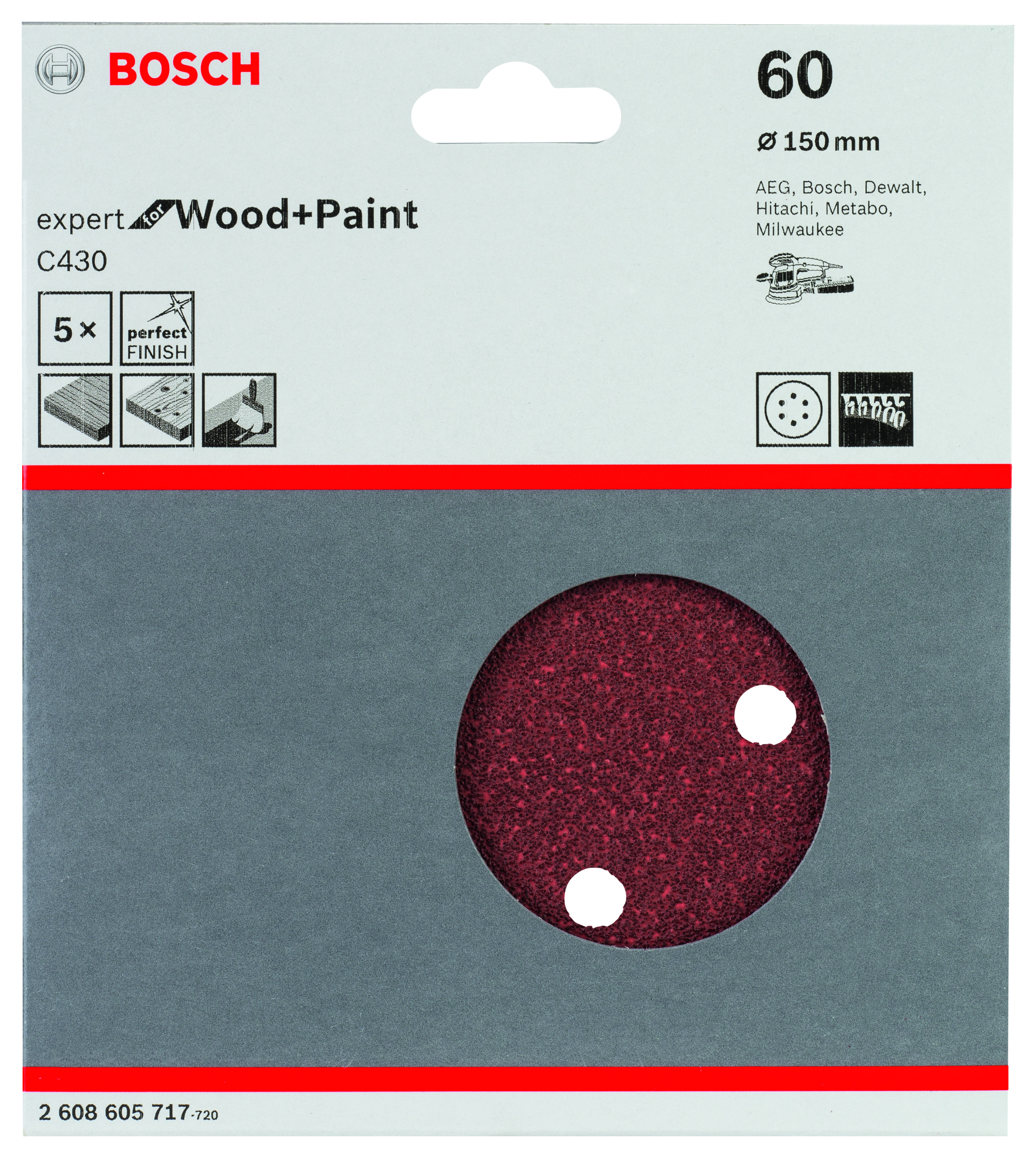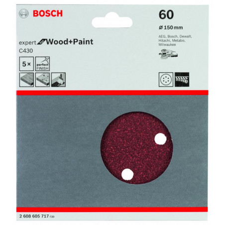 Emballage: 5Marque: BoschRéférence: 2608605717EAN: 3165140172011Description: Abrasif C430 Expert for Wood and Paint, diamètre 150 mm, grain 60, 8 trous, 5x