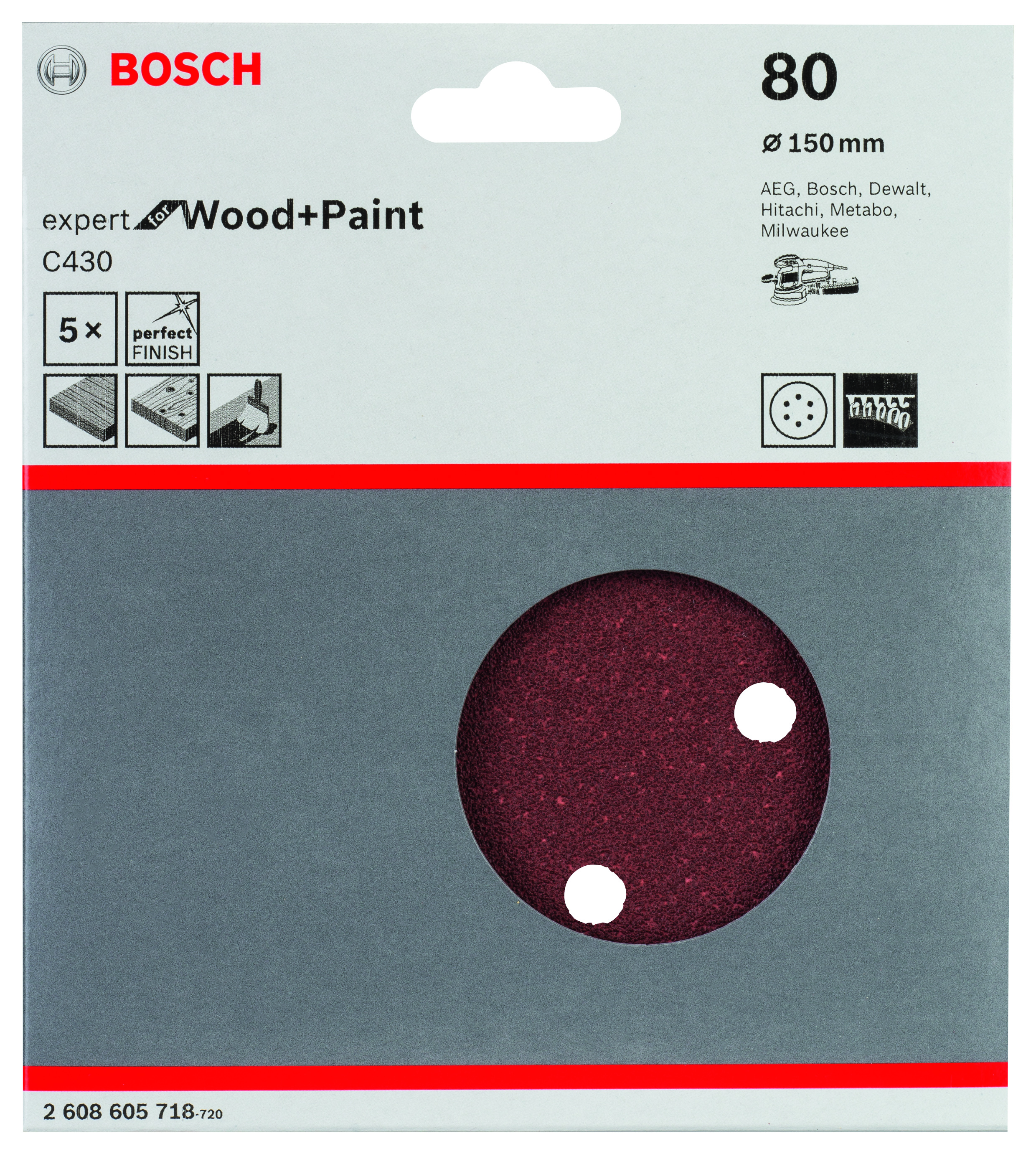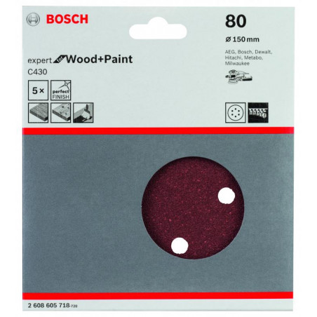 Emballage: 5Marque: BoschRéférence: 2608605718EAN: 3165140172028Description: Abrasif C430 Expert for Wood and Paint, diamètre 150 mm, grain 80, 8 trous, 5x