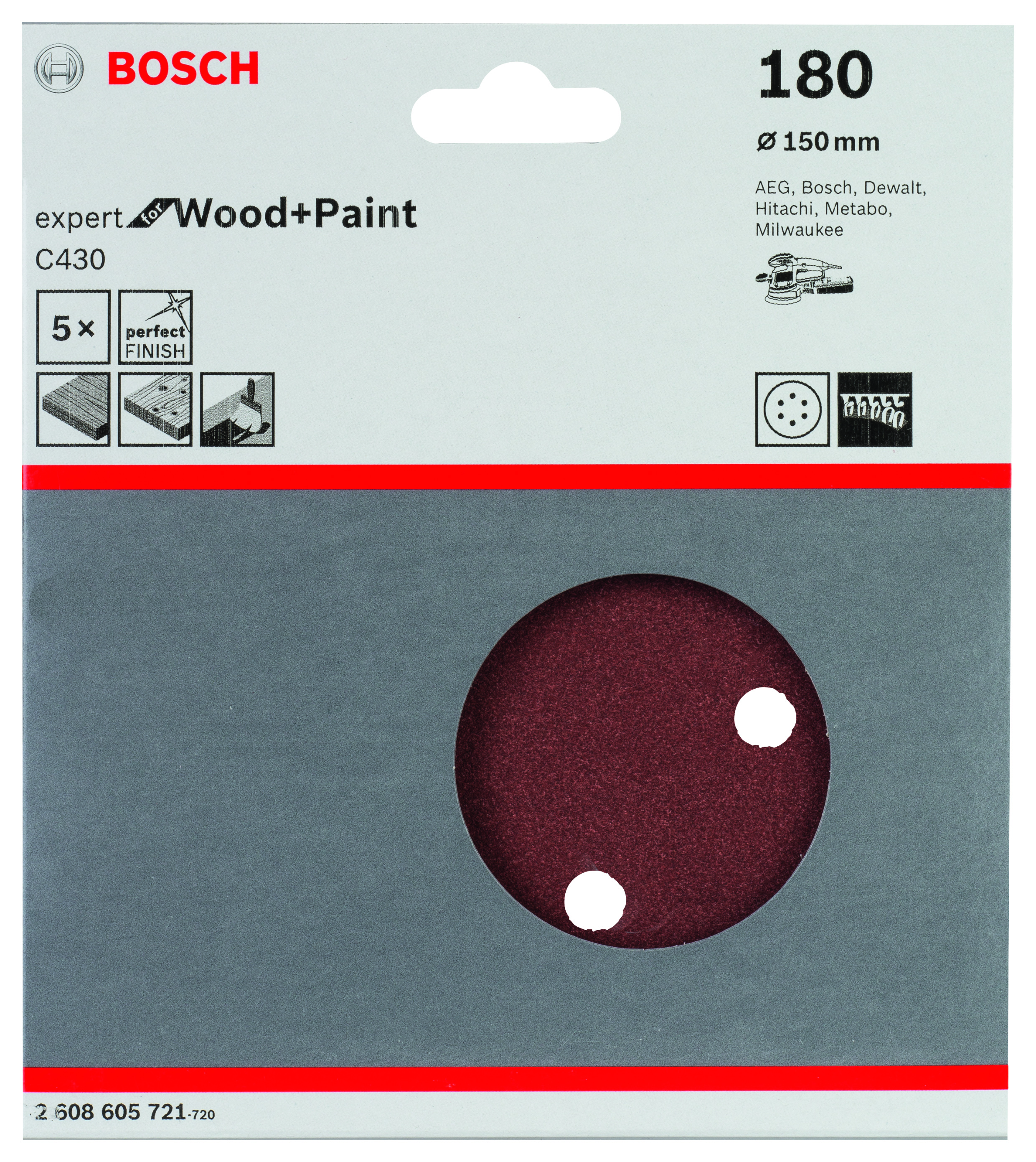 Emballage: 5Marque: BoschRéférence: 2608605721EAN: 3165140172059Description: Abrasif C430 Expert for Wood and Paint, diamètre 150 mm, grain 180, 8 trous, 5x
