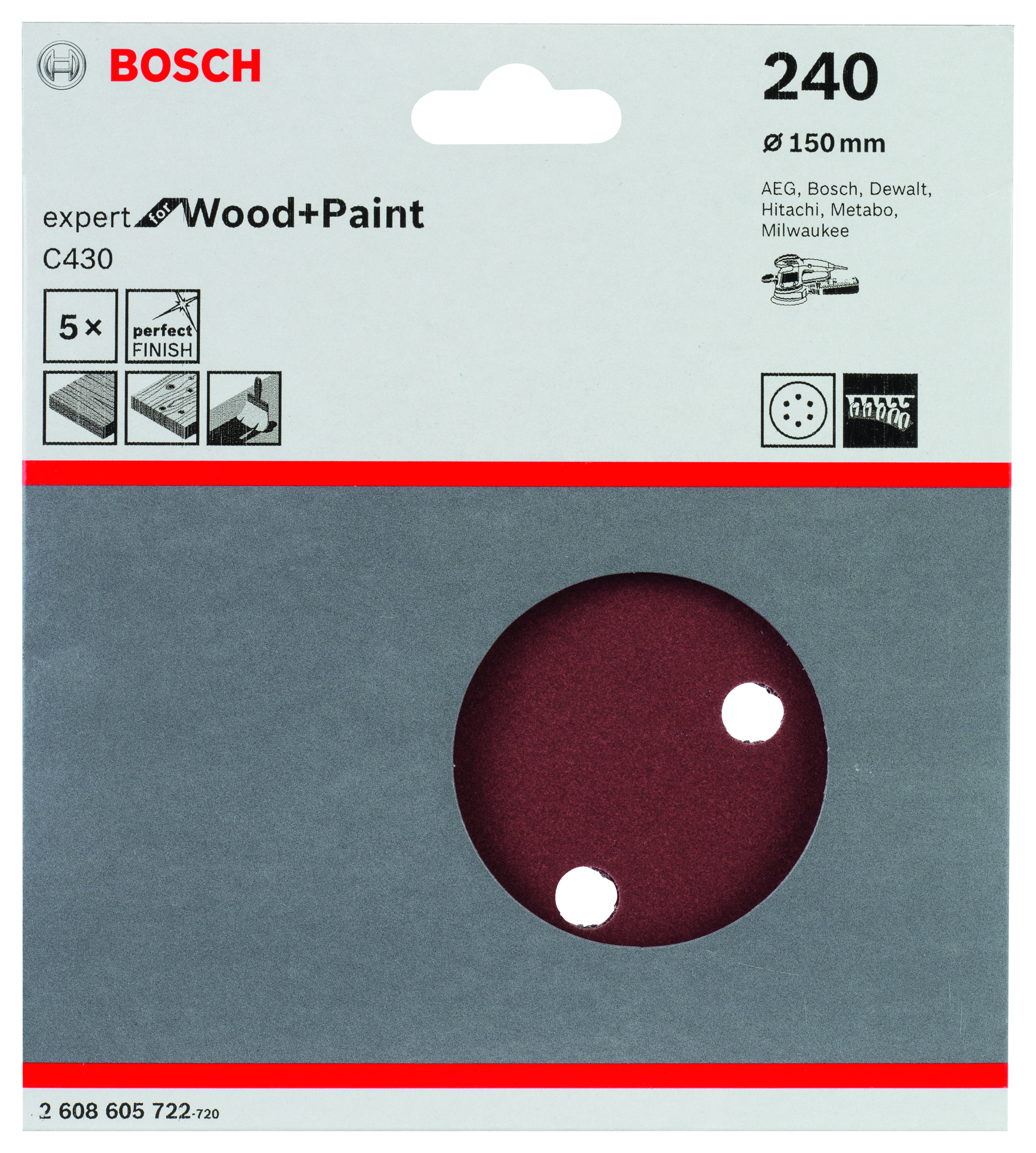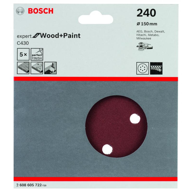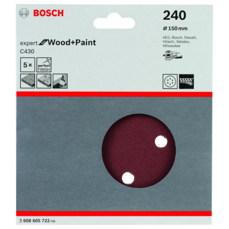 Emballage: 5Marque: BoschRéférence: 2608605722EAN: 3165140172066Description: Abrasif C430 Expert for Wood and Paint, diamètre 150 mm, grain 240, 8 trous, 5x