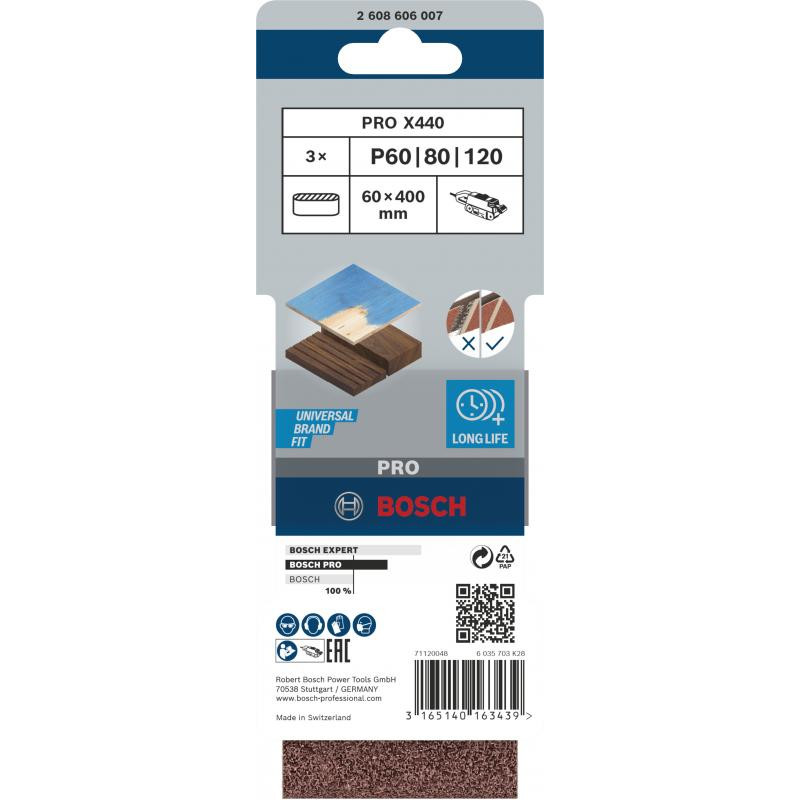 Emballage: 3Marque: BoschRéférence: 2608606007EAN: 3165140163439Description: Assortiment de 3 Bandes de ponçage PRO X440 60x400mm G60 G80 G100