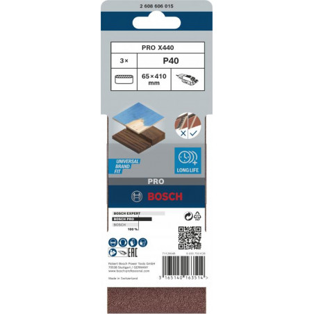 Emballage: 3Marque: BoschRéférence: 2608606015EAN: 3165140163514Description: 3 Bandes de ponçage PRO X440 65x410 mm G40