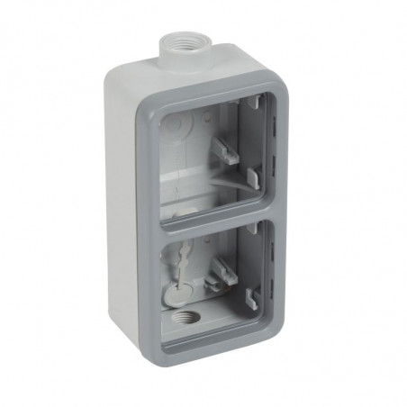 Description: Plexo composable boîtier à presse-étoupe M 20 - 2 postes verticaux - 2 entrées (1 haut/1 bas) - gris - IP 55 - IK 07