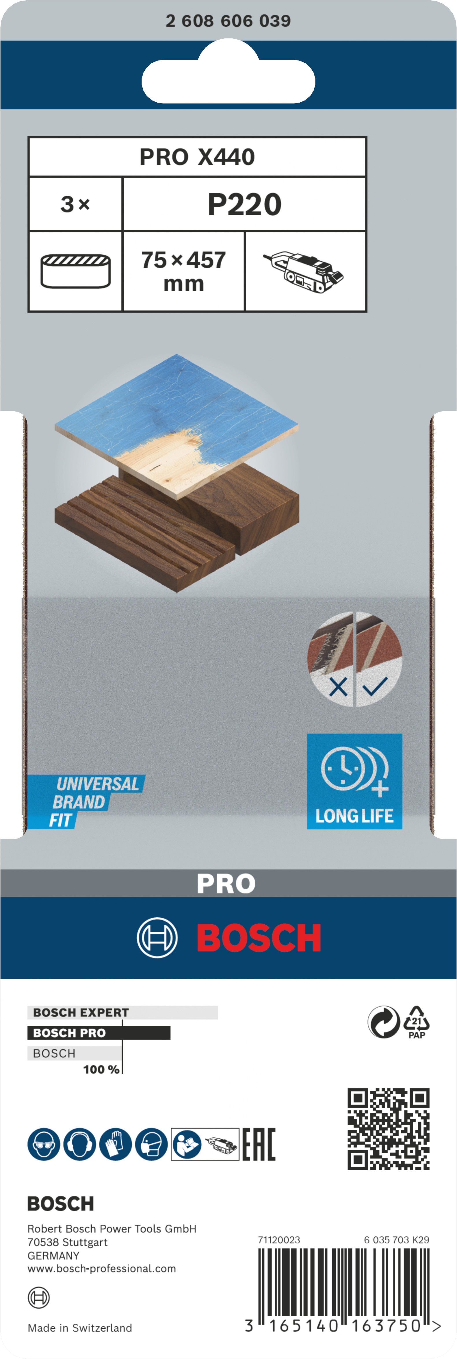 Emballage: 3Marque: BoschRéférence: 2608606039EAN: 3165140163750Description: 3 Bandes de ponçage PRO X440 75x457mm G220