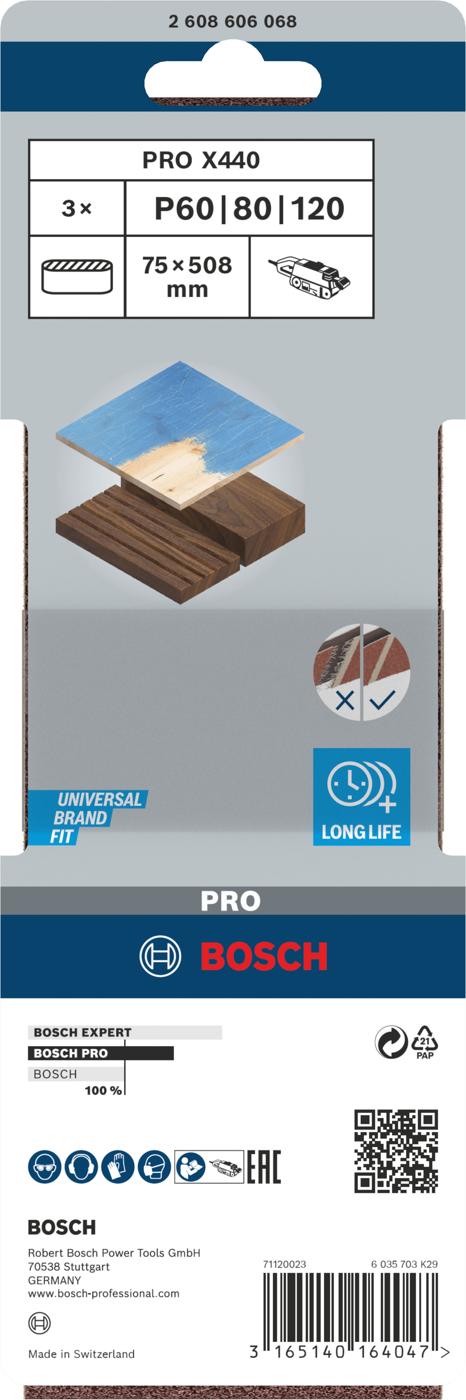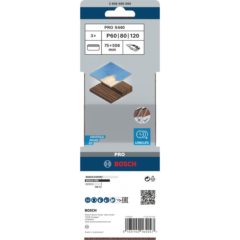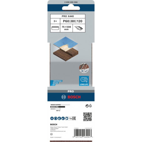 Emballage: 3Marque: BoschRéférence: 2608606068EAN: 3165140164047Description: Assortiment de 3 Bandes de ponçage PRO X440 75x508 mm G60 G80 G100