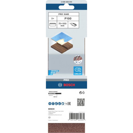 Emballage: 3Marque: BoschRéférence: 2608606072EAN: 3165140164085Description: 3 Bandes de ponçage PRO X440 75x533mm G100