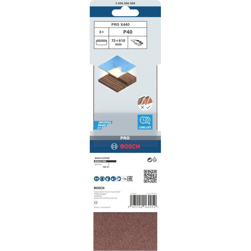 Emballage: 3Marque: BoschRéférence: 2608606089EAN: 3165140164252Description: 3 Bandes de ponçage PRO X440 75x610 mm G40