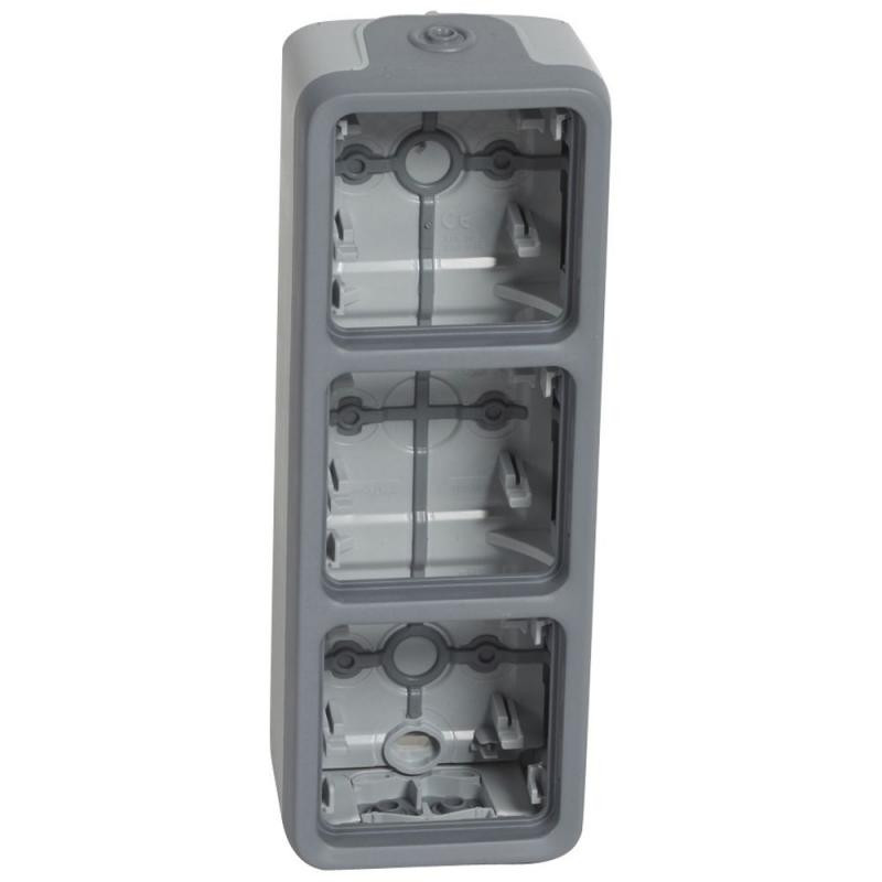 Description: Plexo composable boîtier à embouts - 3 postes verticaux - 2 entrées (1 haut/1 bas) - gris - embouts à membrane, amovibles et perforables sans découpe
