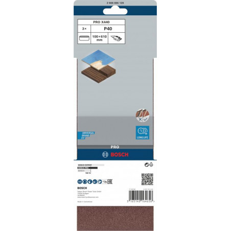 Emballage: 3Marque: BoschRéférence: 2608606129EAN: 3165140164658Description: 3 Bandes de ponçage PRO X440 100x610 mm G40