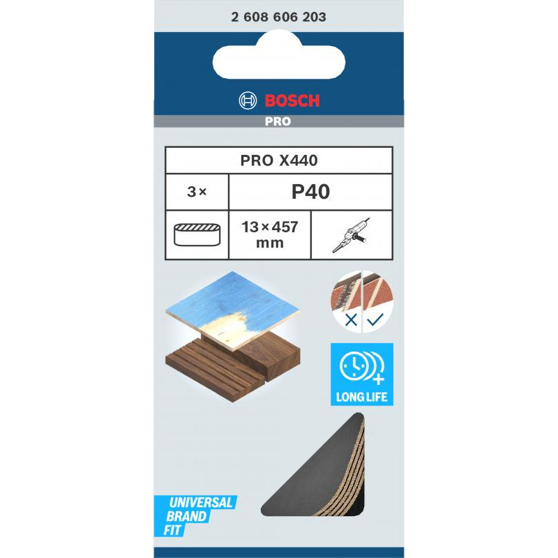 Emballage: 3Marque: BoschRéférence: 2608606203EAN: 3165140165396Description: 3 Bandes de ponçage PRO X440 13x457 mm G40