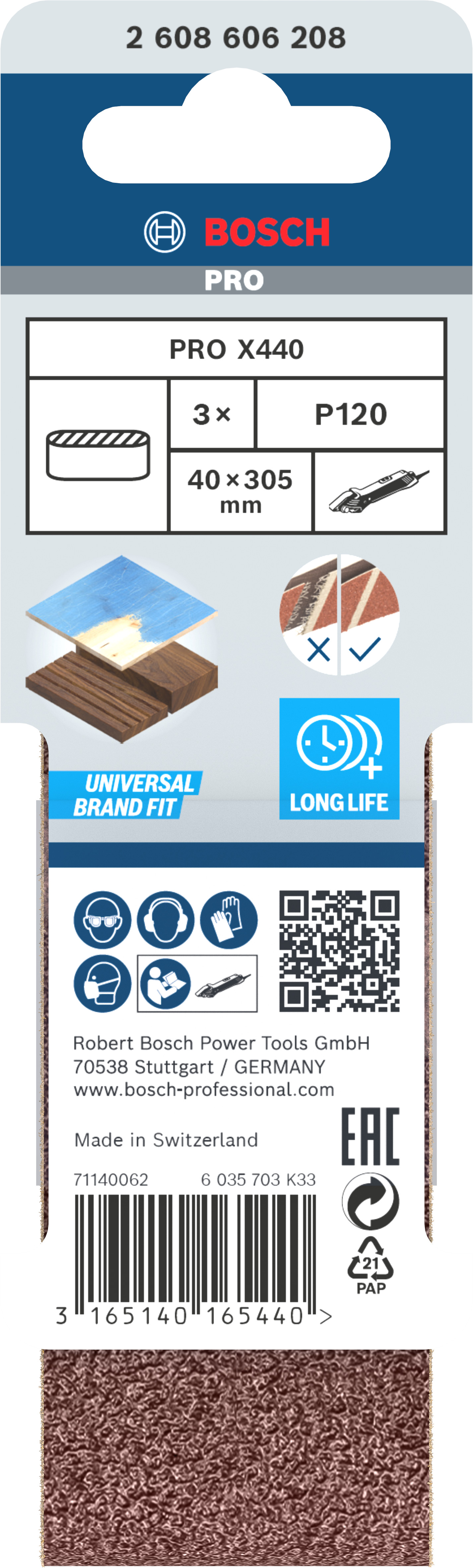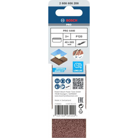 Emballage: 3Marque: BoschRéférence: 2608606208EAN: 3165140165440Description: 3 Bandes de ponçage PRO X440 40x305 mm G120